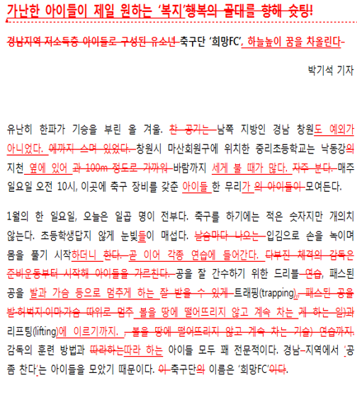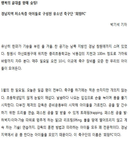 오늘 준비한 기사는 박기석 기자의 <가난한 아이들이 제일 원하는 "복지">입니다. 경남 지역의 소외계층 아이들을 대상으로 한 축구팀 "희망 FC"의 이야기입니다. 스포츠를 즐기며 인성도 함께 함양하는 아이들. 오늘도 구슬땀을 흘리며 축구에 매진합니다.