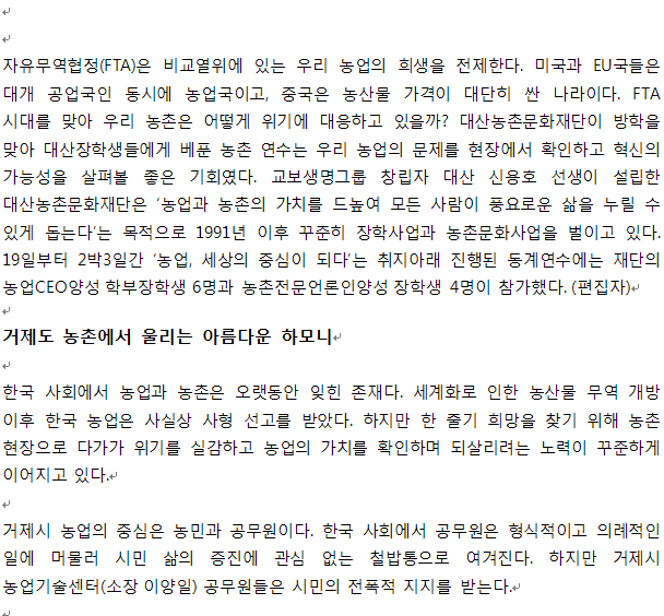 오늘 준비한 기사는 세저리에 기수별로 두 명씩 있는 농촌전문기자들이 다녀온 "대산농촌문화재단 장학생 연수" 참가기입니다. 농업계에서 혁신을 주도하는 분들을 만나고 왔다는군요.
