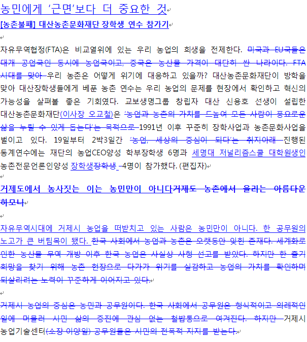 <단비뉴스>에 올라오는 기사의 원본과 최종본은 얼마나 차이날까요? <단비TV>의 영상은 어떻게 수정되었을까요? 교수님들이 어떻게 기사와 영상을 수정하셨는지 배우고 싶으면 이곳 "단비뉴스 편집실"에 자주 들어오세요. 첨삭한 원본과 수정본, 그리고 교수님들의 코멘트를 보실 수 있습니다.