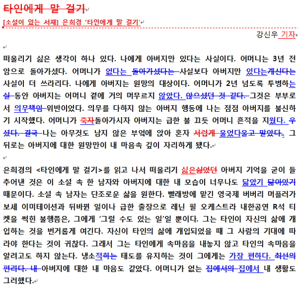 오늘 준비한 기사는 강신우 기자의 소설 ‘타인에게 말 걸기’ 서평입니다. 전체 첨삭본을 보시려면 첨부파일을 열어주세요.