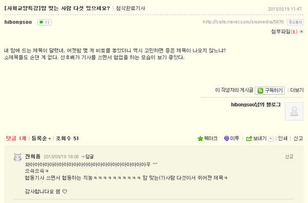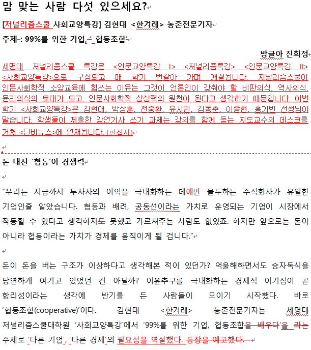 오늘 준비한 기사는 방글아, 진희정 기자가 쓴 특강 기사입니다. 한겨레 김현대 기자가 "99%를 위한 기업, 협동조합"이라는 주제로 강연을 했습니다. 두 기자가 "협동"해서 쓴 "협동조합 기사"가 어떻게 탄생했는지, 그 과정을 공개합니다. 원본과 첨삭본이 얼마나 달라졌는지 확인해보세요. ^^