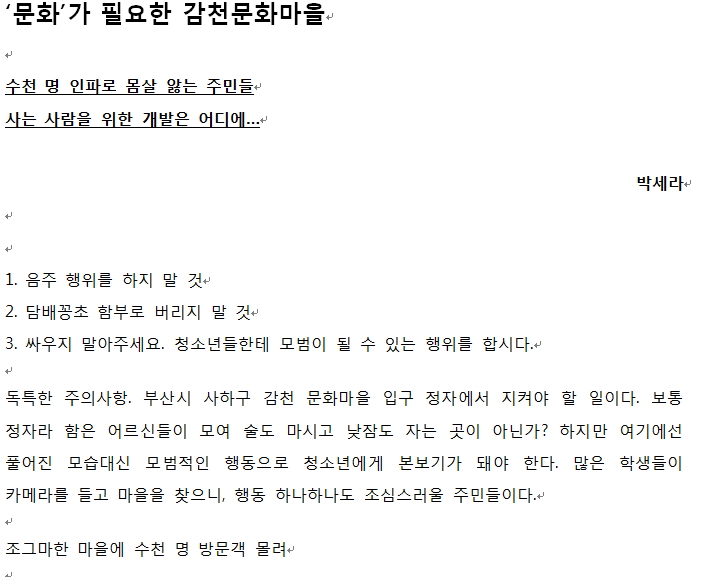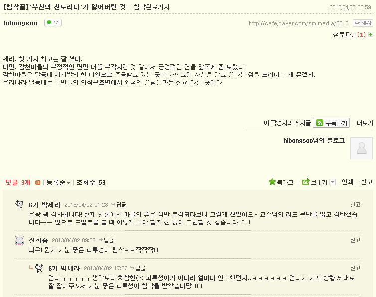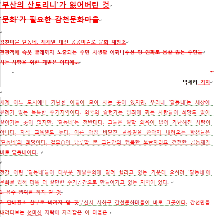 오늘 준비한 기사는 박세라 기자가 쓴 부산 감천문화마을 기사입니다. 공공미술을 통해 "부산의 산토리니"로 이름을 알리게 됐지만, 그로 인해 마을주민들은 말못할 고민이 있다고 하는군요. 박세라 기자가 직접 현장을 다녀왔습니다.