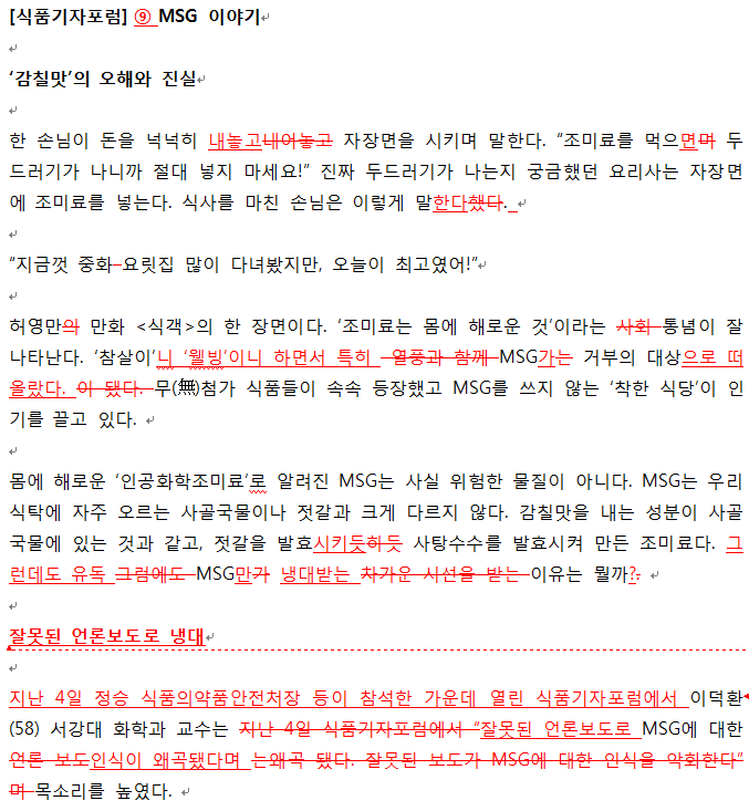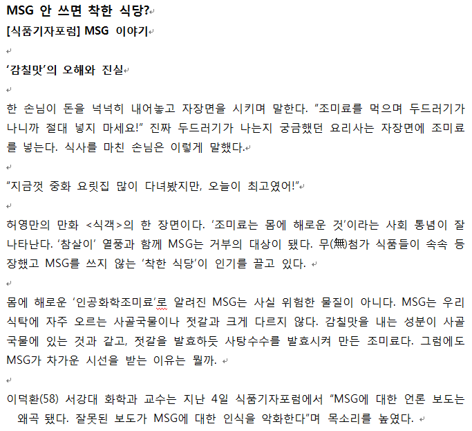 오늘 준비한 기사는 세저리 6기 세 명의 기자가 쓴 식품기자포럼 "MSG 이야기" 입니다. 기사를 읽고 MSG에 대해 가지고 있었던 오해를 풀어보세요^_^ 첨부한 파일을 다운로드 받으시면 첨삭본 전체도 확인할 수 있습니다.