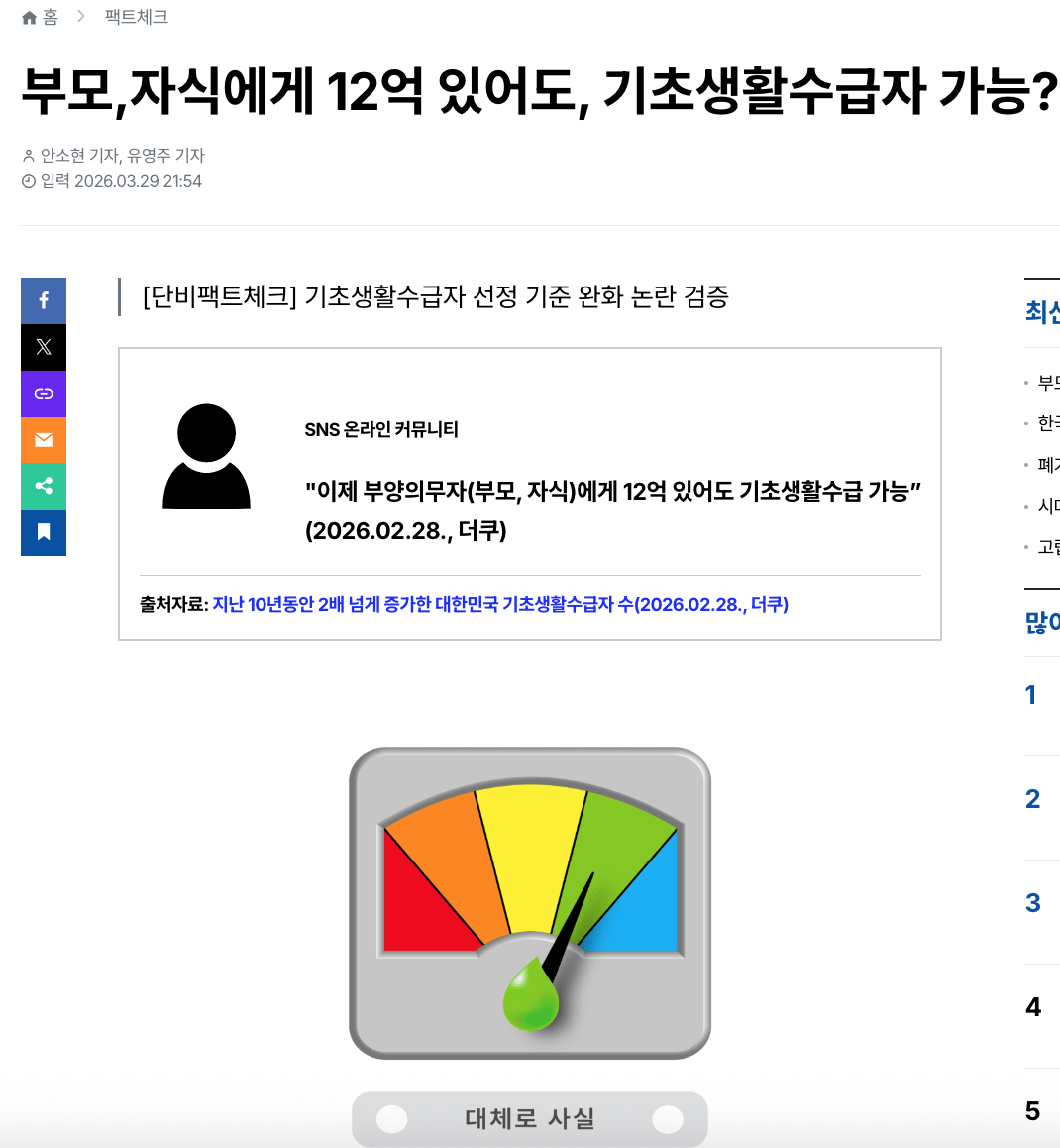 지난달 28일, 온라인 커뮤니티에 ‘지난 10년동안 2배 넘게 증가한 대한민국 기초생활수급자 수’라는 제목의 글이 게시됐다. 글에는 최근 10년 동안 기초생활수급자 수가 증가한 통계 자료와 ‘2026년 기초생활보장 기준 대폭 완화’라는 언론 보도가 포함됐다. 또한 ‘2026년에 달라지는 기초생활수급자 자격’이라는 스레드 캡쳐본이 함께 게시되며 ‘이제 부양의무자(부모, 자식)이 12억이 있어도 기초생활수급 ㅆㄱㄴ(완전 가능)’ 이라는 주장이 담겼다. 캡쳐본에는 의료급여 부양의무자 기준이 ‘부양의무자 연 소득 기준은 1억원에서 1.3억원, 재산 기준은 9억 원에서 12억 원으로 확대’라고 적혀있었다.