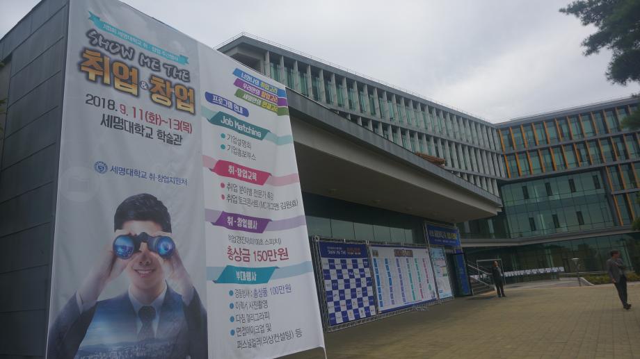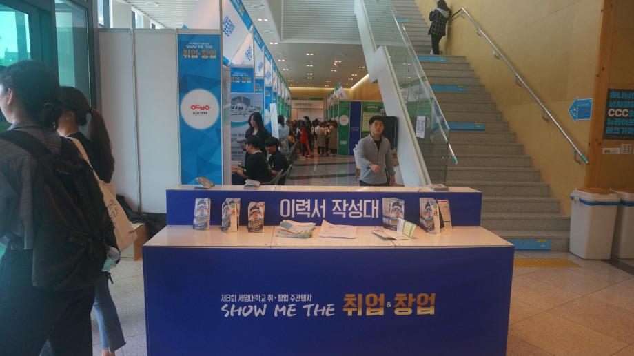 본문 시작 Photo SMU 세명소개 입학/취업 대학/대학원 학사지원 대학생활 연구/산학 기관/시설 SMU Story 소통·공감 학교기업 홈페이지가이드 학생활동 News@SMU 공지사항 보도자료 Photo SMU Media SMU 민송백일장 해카톤 경진대회 학생활동 페이스북 트위터 프린트 제3회 세명대학교 취창업주간행사 기획실 7028 2018-09-13 제3회 세명대학교 취창업주간행사 세명대학교 재학생의 취업과 창업 역량강화를 위한 행사이다. 취업과 창업을 위한 특강 및 설명회가 현장에서 진행되며 실제 기업 인사 담당자가 참가하는 채용부스도 운영한다. 그 외에도 면접 메이크업, 이력서 사진촬영, 인적성 검사 등 다채로운 부대행사도 지원한다. 목록 이전제28회 청룡축전 다음 중국어 시 낭송 대회 담당부서 : 홍보센터 담당자 : 홍보센터 연락처 : 043-649-1175 최종수정일 : 2024-10-26 만족도조사 만족도 조사 이 페이지에서 제공하는 정보에 대하여 만족하시나요? 매우만족 만족 보통 불만족 매우불만족
