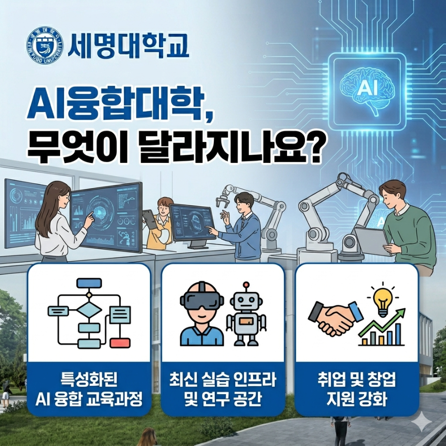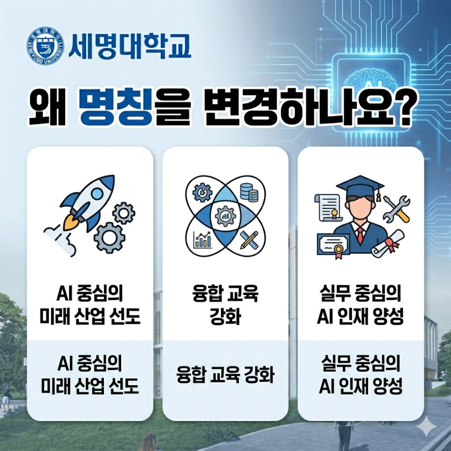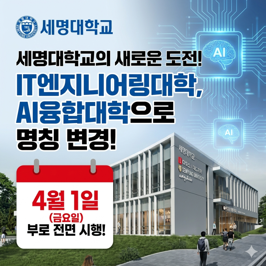 본문 시작 홈으로 커뮤니티 대학소개 학과소개 입학안내 커뮤니티 홈페이지가이드 포토갤러리 대학소식 학과소식 자료실 포토갤러리 포토갤러리 페이스북 트위터 프린트 IT엔지니어링대학이 'AI융합대학'으로 변경되었습니다. AI융합대학 40 2026-04-01 IT에서 AI로, 더 넓어진 미래 IT엔지니어링대학이 AI기반 융합 역량을 바탕으로 'AI융합대학'으로 도약하며 미래를 설계합니다. 새로운 시작ㅡ세명대학교와 함께 하세요. 목록 이전IT단과대를 알려드립니다 (3월) 다음 제5회 세명대학교 벚꽃축제 '벚꽃 세봄' 담당부서 : AI융합대학 담당자 : - 연락처 : 043-649-7422 최종수정일 : 2024-10-26 만족도조사 만족도 조사 이 페이지에서 제공하는 정보에 대하여 만족하시나요? 매우만족 만족 보통 불만족 매우불만족