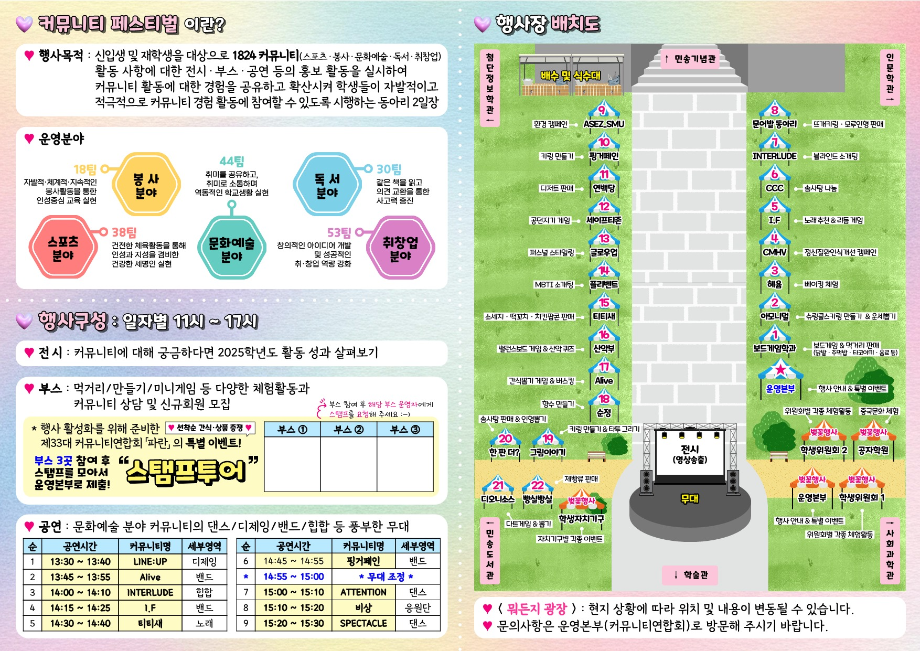 본문 시작 홈으로 커뮤니티 대학소개 학과소개 입학안내 커뮤니티 홈페이지가이드 포토갤러리 대학소식 학과소식 자료실 포토갤러리 포토갤러리 페이스북 트위터 프린트 제11회 커뮤니티 페스티벌 AI융합대학 46 2026-04-04 제11회 커뮤니티 페스티벌 안내 1. 일시/시간 : 4.8.(수) ~ 4.9.(목) 11:00 ~ 17:00 2. 장소: 뭐든지광장 3. 내용 : 먹거리/만들기/미니게임 등 다양한 체험활동과 커뮤니티 상담, 댄스/디제잉/밴드 등 커뮤니티 공연 등 - 제33대 커뮤니티연합회 "파란" - 목록 이전제5회 세명대학교 벚꽃축제 '벚꽃 세봄' 담당부서 : AI융합대학 담당자 : - 연락처 : 043-649-7422 최종수정일 : 2024-10-26 만족도조사 만족도 조사 이 페이지에서 제공하는 정보에 대하여 만족하시나요? 매우만족 만족 보통 불만족 매우불만족