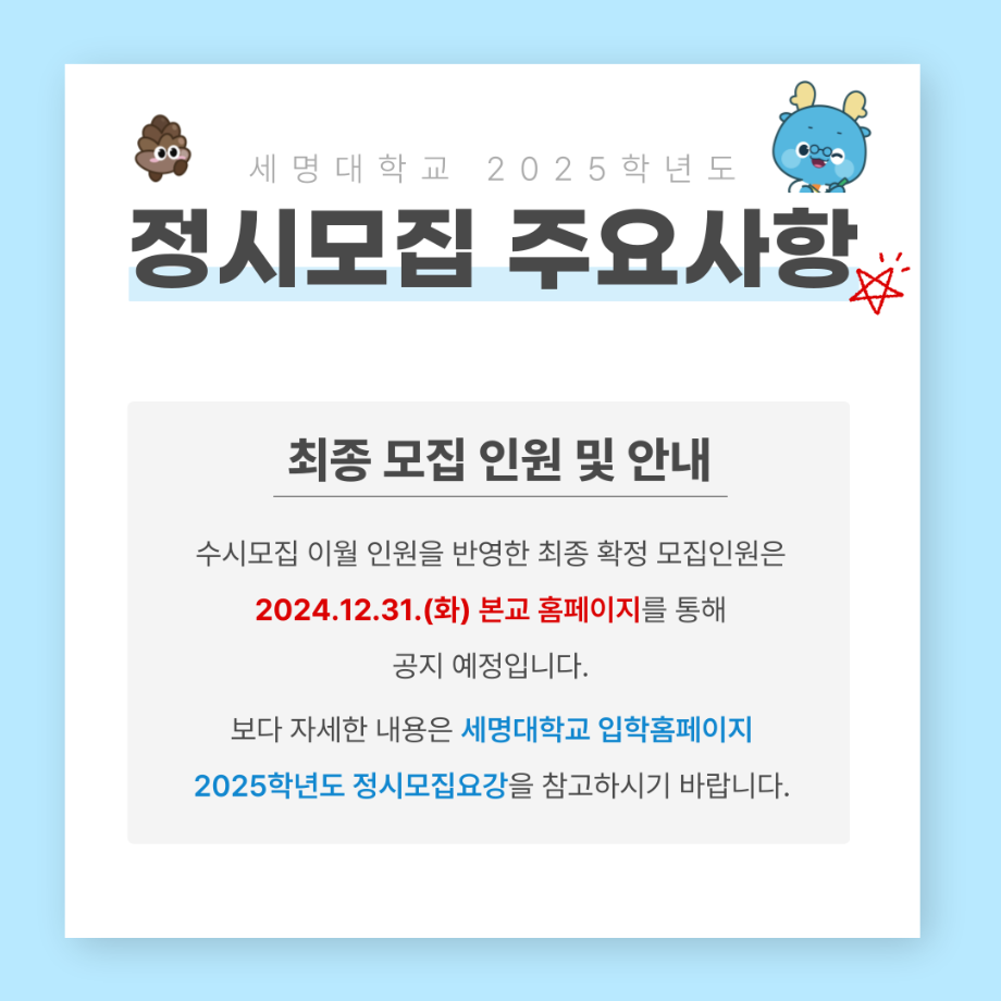 본문 시작 홈으로 커뮤니티 대학소개 학과소개 입학안내 커뮤니티 홈페이지가이드 포토갤러리 대학소식 학과소식 자료실 포토갤러리 포토갤러리 페이스북 트위터 프린트 2025학년도 정시모집 안내 IT엔지니어링대학 1979 2024-12-30 [입학안내 바로가기] 목록 이전수시모집 충원합격자 발표/등록 안내 다음 [KT희망나눔재단] 2025년 KT디지털인재장학생 선발 안내 담당부서 : AI융합대학 담당자 : - 연락처 : 043-649-7422 최종수정일 : 2024-10-26 만족도조사 만족도 조사 이 페이지에서 제공하는 정보에 대하여 만족하시나요? 매우만족 만족 보통 불만족 매우불만족