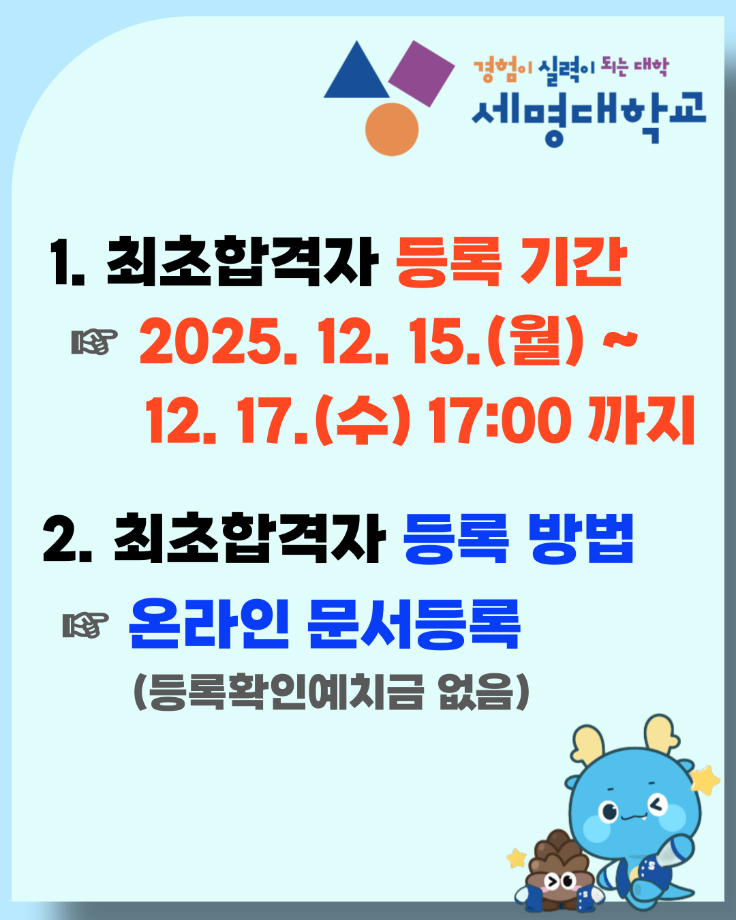 본문 시작 홈으로 커뮤니티 대학소개 학과소개 입학안내 커뮤니티 홈페이지가이드 포토갤러리 대학소식 학과소식 자료실 포토갤러리 포토갤러리 페이스북 트위터 프린트 [2026 수시] 최초합격자 등록 안내 IT엔지니어링대학 649 2025-12-15 [2026 수시] 최초합격자 등록 안내 => 자세한 내용보기 목록 이전2025 드론코더 300 프로젝트 다음 [2026 정시] 모집 안내 담당부서 : AI융합대학 담당자 : - 연락처 : 043-649-7422 최종수정일 : 2024-10-26 만족도조사 만족도 조사 이 페이지에서 제공하는 정보에 대하여 만족하시나요? 매우만족 만족 보통 불만족 매우불만족