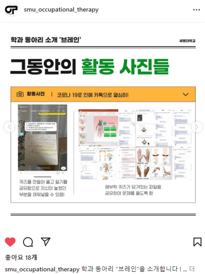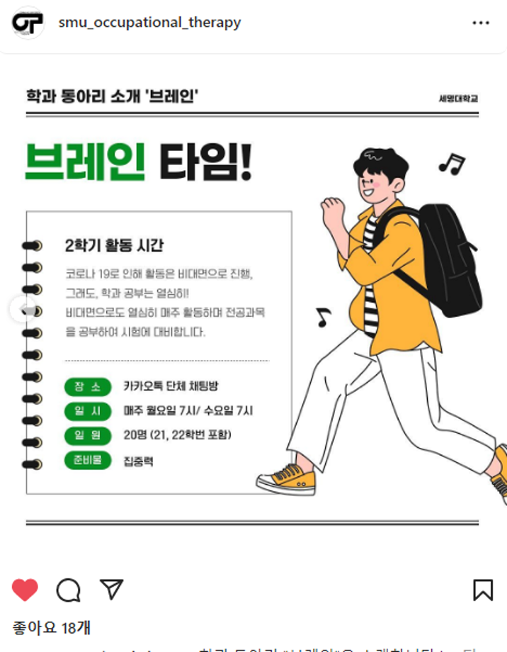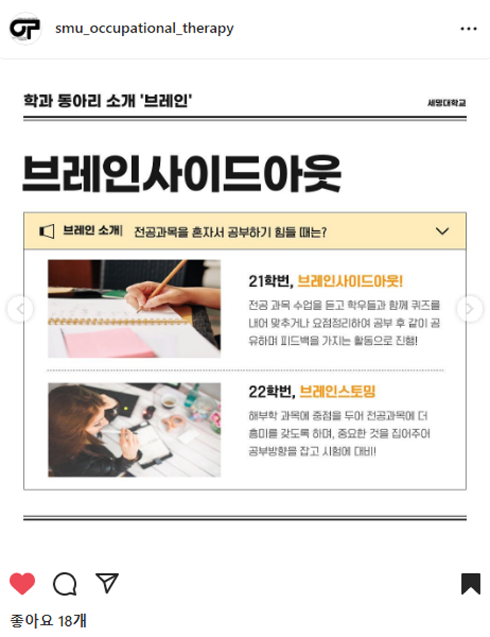 본문 시작 홈으로 커뮤니티 학과소개 진로 및 취업 학과과정 커뮤니티 SNS 홈페이지가이드 학과 소식 및 행사 학과공지 학과 소식 및 행사 대학생활 엿보기 어쩌다 출근 챌린지 학생회 동아리 통학버스 시간표 학과 소식 및 행사 페이스북 트위터 프린트 동아리 소개[브레인] 작업치료학과 4512 2022-10-13 목록 이전semyung birthday cake challenge 다음 동아리 소개[세슐랭] 담당부서 : 작업치료학과 담당자 : - 연락처 : 043-649-1632 최종수정일 : 2024-10-26 만족도조사 만족도 조사 이 페이지에서 제공하는 정보에 대하여 만족하시나요? 매우만족 만족 보통 불만족 매우불만족