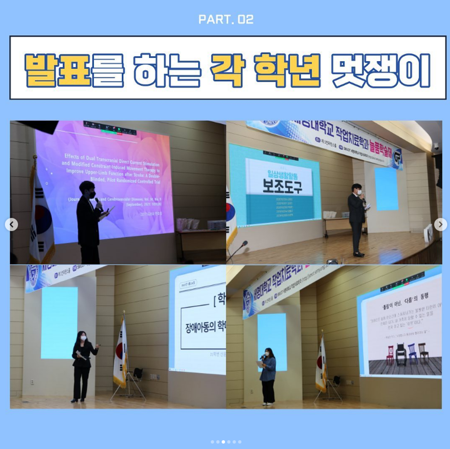 세명대학교 작업치료학과는 재학생들의 연구 역량과 학술 활동을 촉진 시키고, 선∙후배 간의 단합과 화합을 도모하기 한 목적으로 매년 “늘품 학술제”를 실시하고 있습니다.