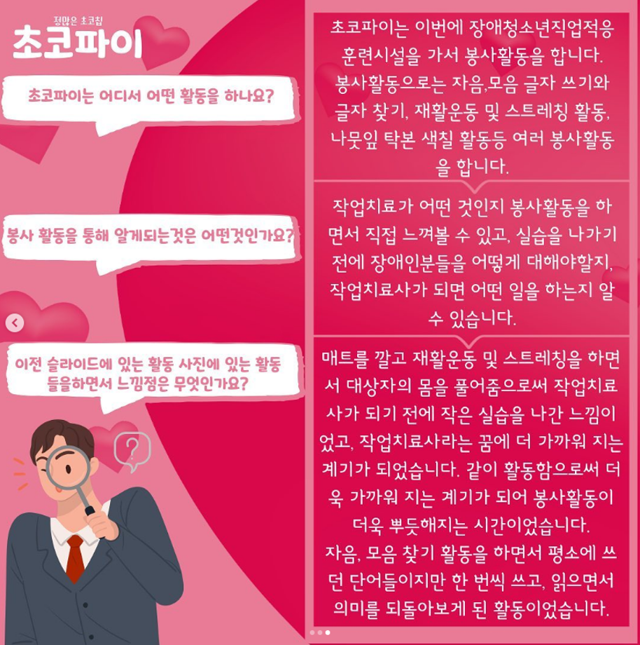 본문 시작 홈으로 커뮤니티 학과소개 진로 및 취업 학과과정 커뮤니티 SNS 홈페이지가이드 학과 소식 및 행사 학과공지 학과 소식 및 행사 대학생활 엿보기 어쩌다 출근 챌린지 학생회 동아리 통학버스 시간표 학과 소식 및 행사 페이스북 트위터 프린트 동아리 소개 [초코파이] 작업치료학과 4502 2022-10-26 목록 이전동아리 소개 [9988] 다음 2022 실습후기모음 (아동파트 대학병원, 종합병원) 담당부서 : 작업치료학과 담당자 : - 연락처 : 043-649-1632 최종수정일 : 2024-10-26 만족도조사 만족도 조사 이 페이지에서 제공하는 정보에 대하여 만족하시나요? 매우만족 만족 보통 불만족 매우불만족