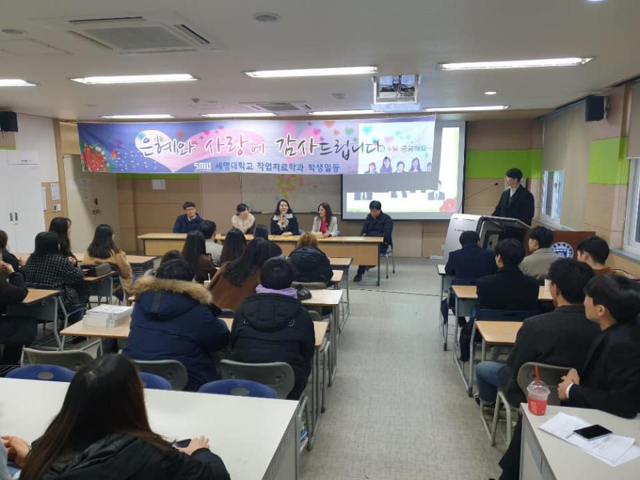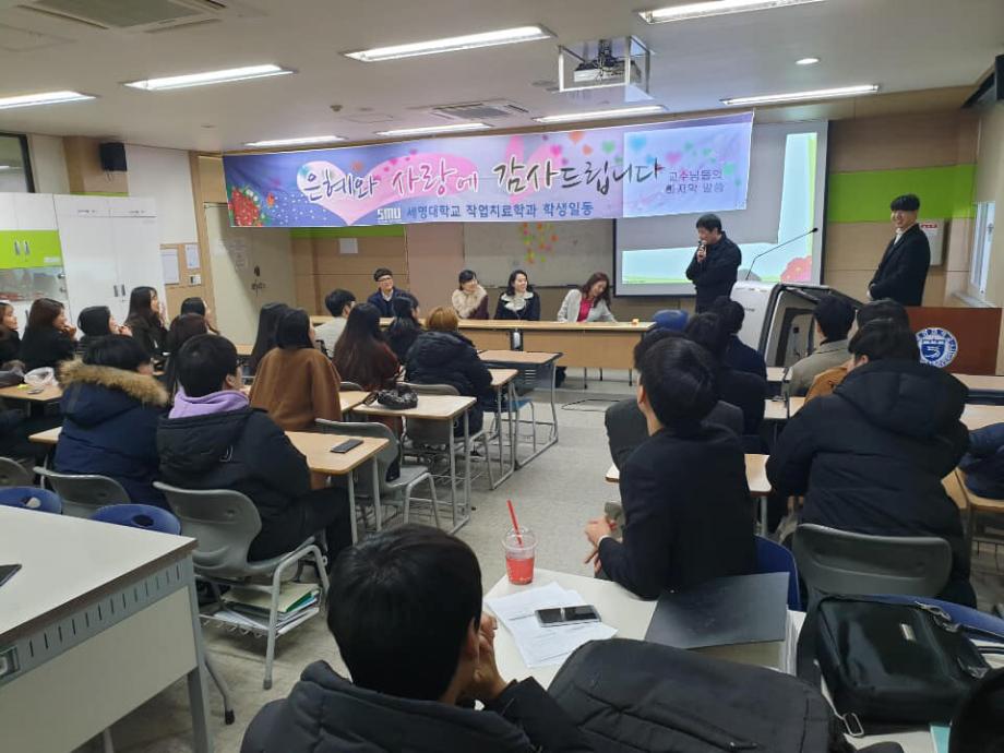본문 시작 홈으로 커뮤니티 학과소개 진로 및 취업 학과과정 커뮤니티 SNS 홈페이지가이드 학과 소식 및 행사 학과공지 학과 소식 및 행사 대학생활 엿보기 어쩌다 출근 챌린지 학생회 동아리 통학버스 시간표 학과 소식 및 행사 페이스북 트위터 프린트 2018년도 사은회 작업치료학과 7065 2018-12-10 12월 10일, 작업치료사 국가시험을 보고 돌아온 4학년 학생들이 교수님들을 모시고 사은회를 진행하였습니다. 사은회는 과대표 학생의 편지 낭독, 그동안 교수님들께 궁금했던 질문들, 마지막으로 4학년 학생들에게 하고 싶은 교수님의 말씀 순으로 진행하였습니다. 4학년 학생들이 졸업하기 전 교수님들과 거리감 없이 함께 나눌 수 있는 좋은 시간이었습니다. 그동안 많은 가르침을 주신 스승의 은혜를 잊지 않겠습니다. 감사합니다. 목록 이전제46회 작업치료사 국가시험 다음 2018 임상실습 간담회 담당부서 : 작업치료학과 담당자 : - 연락처 : 043-649-1632 최종수정일 : 2024-10-26 만족도조사 만족도 조사 이 페이지에서 제공하는 정보에 대하여 만족하시나요? 매우만족 만족 보통 불만족 매우불만족