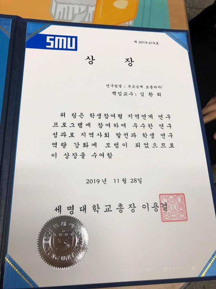 11월 28일 세명대학교 작업치료학과는 김환희교수님 지도아래 4학년(유연수, 도하연, 박소진, 안소현, 이수미, 임주희)과 1학년(권세정, 김보미, 이채원, 최현희)이 협동하여 [학생참여연구]를 수행하였다. 본 연구는 대학혁신지원사업의 일환인 학생참여형 지역연계 연구 프로그램으로 제천시노인복지관과 협력하여 진행되었다. 작업치료학과 [부모님께 효돌하자!]팀의 연구 목적은 사물인터넷(lot) 기반의 스마트 반려인형(효돌이)을 사용하여 제천시에 거주하는 노인의 돌봄체계를 지원하는 것이었다. 지역사회 어르신에게도 인정받고 연구의 긍정적인 효과가 두드러지게 나타났으며, 세명대학교에서 시행된 연구 성과 발표회에서는 최우상을 수상하는 영광을 받았다. 앞으로도 세명대학교 작업치료학과 학생들은 전공수업을 통해 배운 작업치료 지식을 직접 적용해 봄으로써 미래 작업치료사로서의 참(CHARM) 역량을 키우는 계기가 확대 될 것이다.