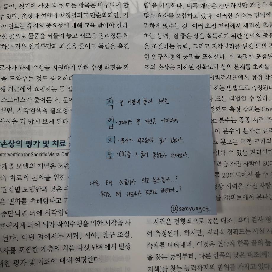 본문 시작 홈으로 커뮤니티 학과소개 진로 및 취업 학과과정 커뮤니티 SNS 홈페이지가이드 학과 소식 및 행사 학과공지 학과 소식 및 행사 대학생활 엿보기 어쩌다 출근 챌린지 학생회 동아리 통학버스 시간표 학과 소식 및 행사 페이스북 트위터 프린트 작업치료 4행시 콘테스트 작업치료학과 7775 2020-06-16 많은 사람에게 작업치료가 무엇인지 알리고, 대중화되길 바라는 마음으로 "작업치료"로 4행시 콘테스트를 진행하게 되었습니다. 4행시 콘데스트로 단순히 작업치료를 알릴 뿐만 아니라, 작업치료학과 학생으로서 한 번 더 생각해보고 자아 성찰하는 시간을 갖게 된 것 같습니다. 목록 이전2020학년도 온라인강의 실시 다음 마스크 인증샷 챌린지 담당부서 : 작업치료학과 담당자 : - 연락처 : 043-649-1632 최종수정일 : 2024-10-26 만족도조사 만족도 조사 이 페이지에서 제공하는 정보에 대하여 만족하시나요? 매우만족 만족 보통 불만족 매우불만족