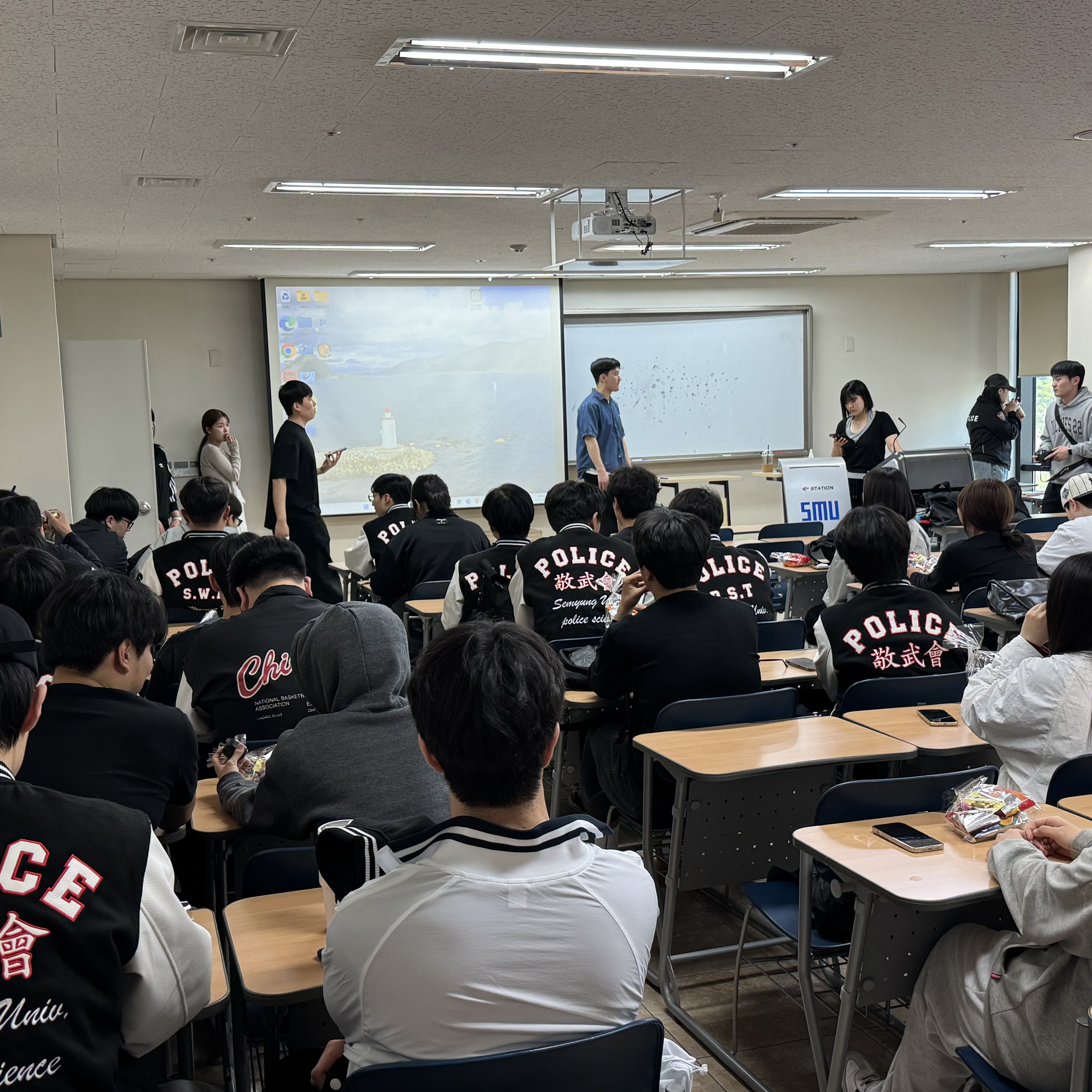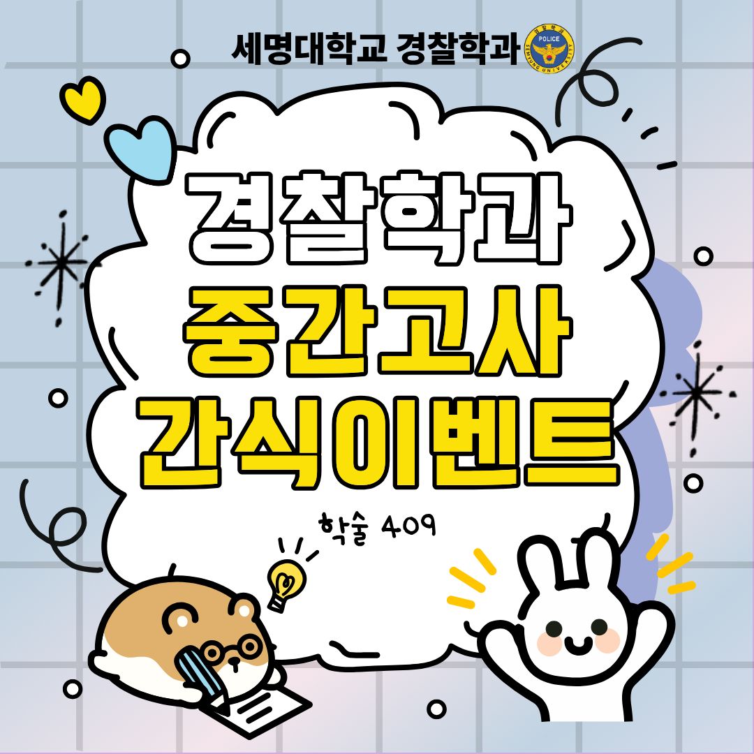 본문 시작 홈으로 커뮤니티 학과소개 교수소개 학과과정 커뮤니티 홈페이지가이드 학부공지 학부공지 학과일정 포토갤러리 학생회 동아리 학부공지 페이스북 트위터 프린트 2026-1학기 중간고사 이벤트 경찰학과 조회 : 8 등록일 : 2026-04-16 안녕하십니까 세명대학교 경찰학과 제24대 학생회 ‘휘연’입니다. 지난 4월 15일, 기말고사 간식 이벤트를 진행하였습니다. 기타 문의 사항은 연락해 주시면 답변해 드리겠습니다. 목록 이전경찰학과 26학번 과잠 배부 만족도조사 만족도 조사 이 페이지에서 제공하는 정보에 대하여 만족하시나요? 매우만족 만족 보통 불만족 매우불만족