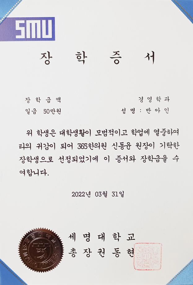 본문 시작 홈으로 커뮤니티 학과소개 학생진로 교과과정 커뮤니티 학과 SNS 홈페이지가이드 학과 갤러리 공지사항 대학원 학과 갤러리 학과 이야기 동아리 학생회 학과 갤러리 페이스북 트위터 프린트 경영학과 20학번 반아인 장학생 경영학과 2578 2022-04-06 03월 31일, 경영학과 20학번 반아인 학생은 학업성적이 우수하고 성실한 학과 생활로 타의 귀감이 되어 365한의원 신동윤 대표원장이 기탁한 장학생으로 선정되었으며 장학금 기탁 및 장학증서 수여식에 참석하였습니다. 목록 이전사회 새내기의 필수 역량 강화 다음 2022 경영학과 체육대회 담당부서 : 경영학과 담당자 : - 연락처 : 043-649-1766 최종수정일 : 2024-10-26 만족도조사 만족도 조사 이 페이지에서 제공하는 정보에 대하여 만족하시나요? 매우만족 만족 보통 불만족 매우불만족