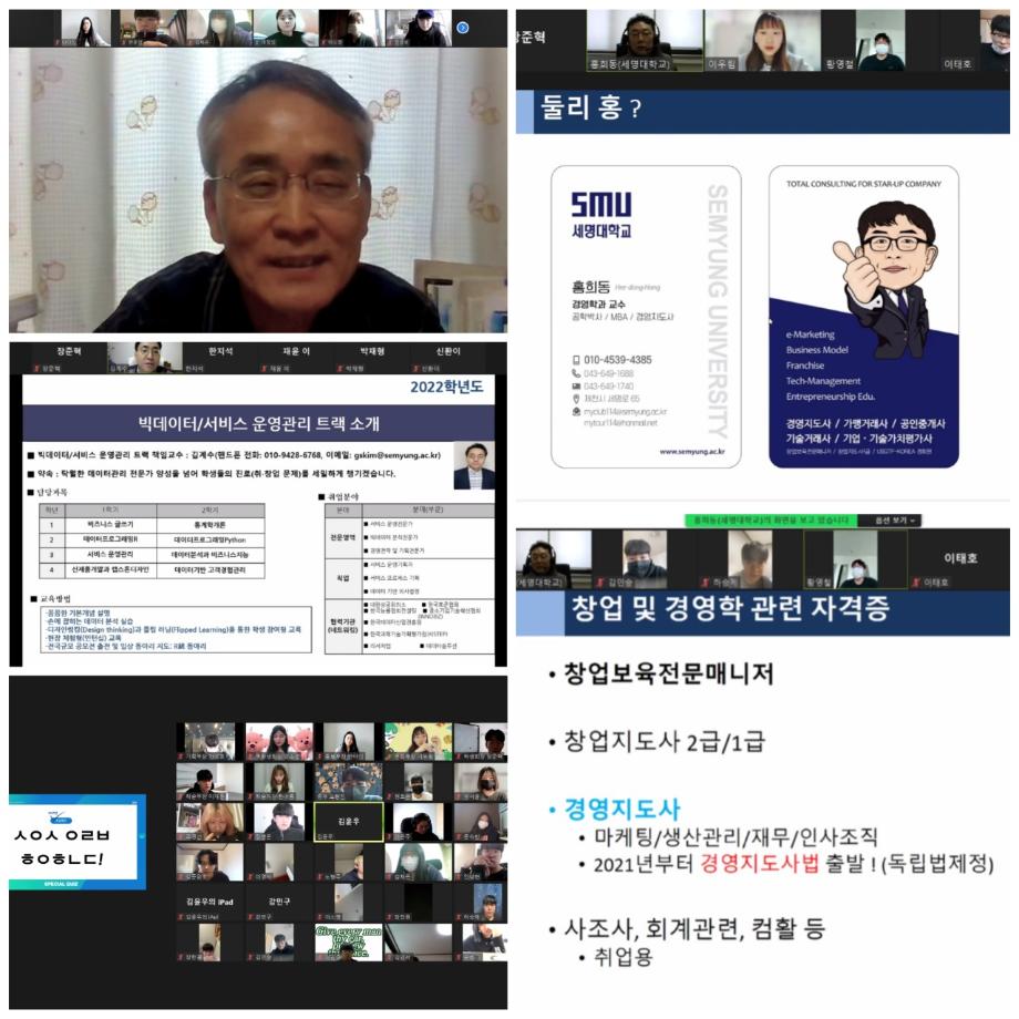 본문 시작 홈으로 커뮤니티 학과소개 학생진로 교과과정 커뮤니티 학과 SNS 홈페이지가이드 학과 갤러리 공지사항 대학원 학과 갤러리 학과 이야기 동아리 학생회 학과 갤러리 페이스북 트위터 프린트 2022 신입생 온라인 꿈설계학기 경영학과 2473 2022-02-28 2022 신입생 온라인 오티인 꿈설계가 23일 열렸습니다. 김훈, 김계수, 곽지영, 홍희동, 함상우, 우태우, 최건동 교수님과 함께 학생회가 준비한 온라인 행사!! 장윤주 컨설턴트님의 특강, 학생회 주관 경영퀴즈, 트랙별 소개등 다양한 프로그램으로 신입생들이 서로 친해지고 정보를 얻는 즐겁고 유익한 시간이었습니다 목록 이전2022 신년 학과 워크샵 다음 2022 신입생 새내기 배움터 담당부서 : 경영학과 담당자 : - 연락처 : 043-649-1766 최종수정일 : 2024-10-26 만족도조사 만족도 조사 이 페이지에서 제공하는 정보에 대하여 만족하시나요? 매우만족 만족 보통 불만족 매우불만족