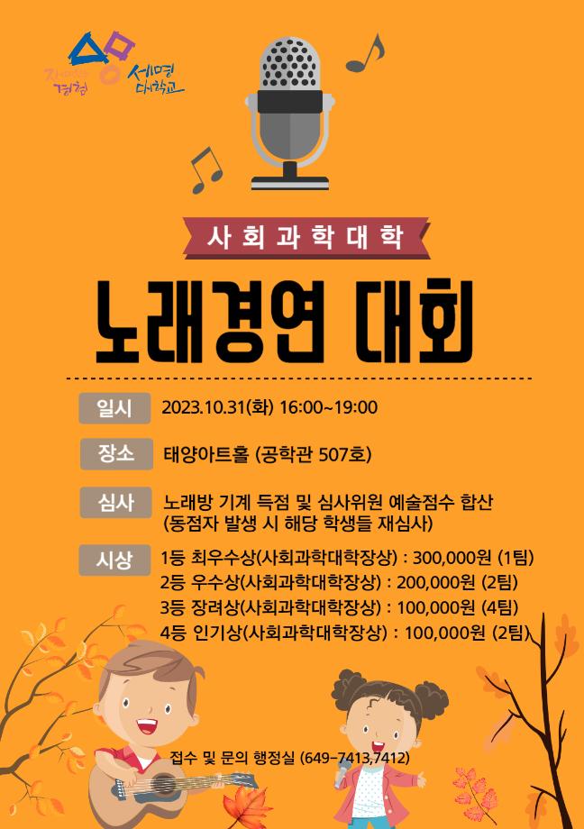 본문 시작 홈으로 커뮤니티 학과소개 학생진로 교과과정 커뮤니티 학과 SNS 홈페이지가이드 학과 갤러리 공지사항 대학원 학과 갤러리 학과 이야기 동아리 학생회 학과 갤러리 페이스북 트위터 프린트 [경영학과] 사회과학대학 노래경연대회 수상 경영학과 3294 2023-11-16 안녕하세요, 세명대학교 경영학과입니다! 10월 31일 화요일에 진행되었던 사회과학대학 노래경연대회에서 20학번 문정현 학생은 최우수상을, 21학번 신인애 학생은 장려상을 수상하였습니다! 멋진 무대와 감미로운 노래 실력 보여준 두 학생에게 큰 박수 부탁드립니다ㅎㅎ 목록 이전[경영학과] 대학원 논문 발표 다음 [경영학과] 한국생산관리학회 우수발표 논문상 수상 담당부서 : 경영학과 담당자 : - 연락처 : 043-649-1766 최종수정일 : 2024-10-26 만족도조사 만족도 조사 이 페이지에서 제공하는 정보에 대하여 만족하시나요? 매우만족 만족 보통 불만족 매우불만족