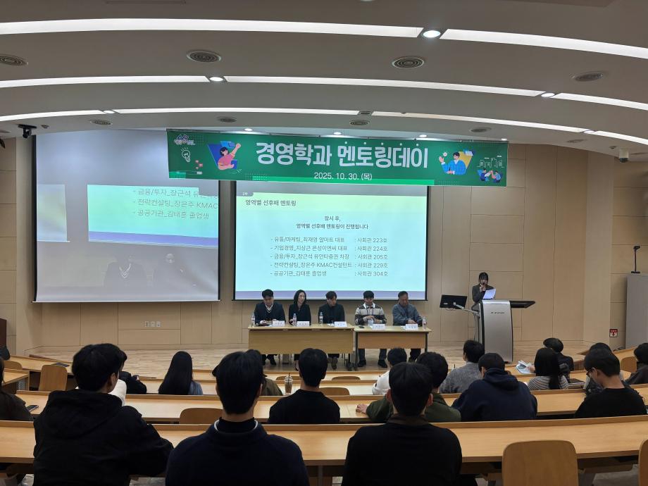 본문 시작 홈으로 커뮤니티 학과소개 학생진로 교과과정 커뮤니티 학과 SNS 홈페이지가이드 학과 갤러리 공지사항 대학원 학과 갤러리 학과 이야기 동아리 학생회 학과 갤러리 페이스북 트위터 프린트 [경영학과] 멘토링데이 행사 경영학과 1268 2025-11-03 10월 30일(목) 17시, 학술관 102호에서 경영학과 멘토링데이가 개최되었습니다. 1부에서는 맞춤형 진로/직무 멘토링이, 2부에서는 멘토-멘티 간 자유로운 교류 및 1:1 멘토링, 저녁 식사가 진행되었습니다. 이번 멘토링데이를 통해 학생들이 진로에 대한 이해와 자기주도적 성장 의지를 높일 수 있는 시간이었습니다. 참여해 주신 모든 멘토 멘티 여러분, 수고 많으셨습니다! 목록 이전[일반대학원 경영학과] 논문 발표 및 논문심사 다음 [경영학과] 25년 전기 학위수여식 학과행사 담당부서 : 경영학과 담당자 : - 연락처 : 043-649-1766 최종수정일 : 2024-10-26 만족도조사 만족도 조사 이 페이지에서 제공하는 정보에 대하여 만족하시나요? 매우만족 만족 보통 불만족 매우불만족