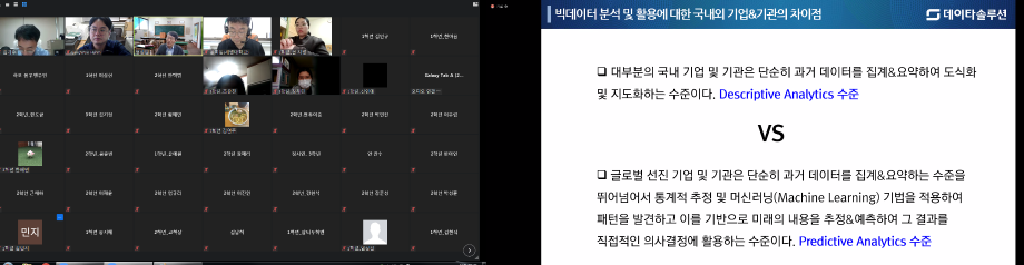 본문 시작 홈으로 커뮤니티 학과소개 학생진로 교과과정 커뮤니티 학과 SNS 홈페이지가이드 학과 갤러리 공지사항 대학원 학과 갤러리 학과 이야기 동아리 학생회 학과 갤러리 페이스북 트위터 프린트 경영학과 학술특강: 빅데이터와 예측분석. 무엇을 예측하고 어떻게 활용할 것인가? 경영학과 4388 2021-05-20 5월 20일 (목요일) 오전 10:30. 경영학과 학술 특강으로 데이터솔루션 정성원 상무님꼐서 빅데이터와 예측분석. 무엇을 예측하고 어떻게 활용할 것인가? 에 대해 특강을 해주셨습니다. 54명의 교수, 학생들이 참여하여 온라인(zoom)에서 안전하게 진행되었습니다. 4차 산업시대 빅데이터 활용을 위해 학생들에게 필요한 실무적 지식과 역량을 알아보는 뜻깊은 시간이었습니다. 목록 이전신입생 환영회 및 경영학과 행사 다음 2021 고교특강 (제천제일고) 담당부서 : 경영학과 담당자 : - 연락처 : 043-649-1766 최종수정일 : 2024-10-26 만족도조사 만족도 조사 이 페이지에서 제공하는 정보에 대하여 만족하시나요? 매우만족 만족 보통 불만족 매우불만족
