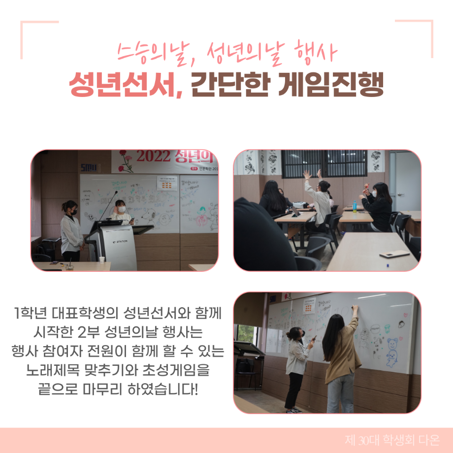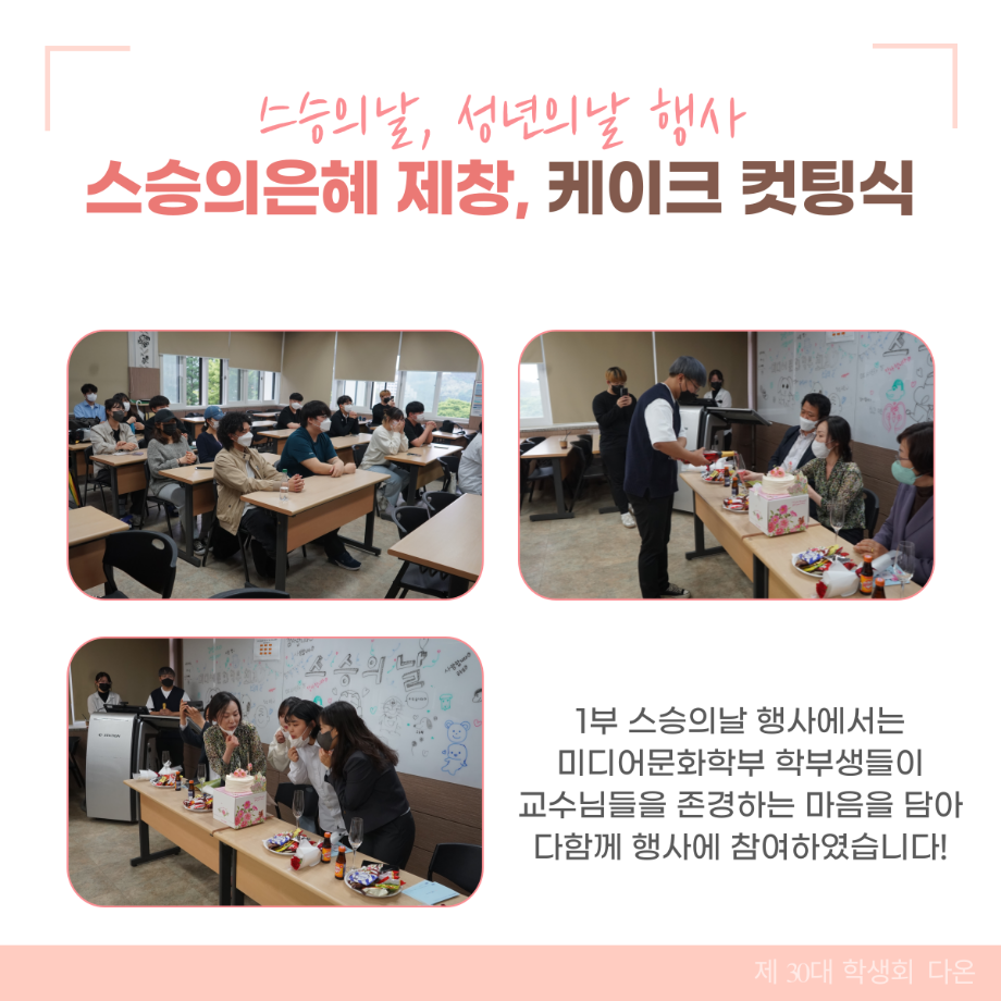 본문 시작 홈으로 커뮤니티 학부소개 교육과정 학부소식 커뮤니티 홈페이지가이드 학생회 학생회 동아리 자료실 장비대여 자유게시판 학생회 페이스북 트위터 프린트 [학생회 활동] 스승의날, 성년의날 행사 되돌아보기 학생회 3287 2022-05-20 지난 5월13일에 미디어문화학부 스승의날과 성년의날 행사가 있었습니다! 행사 진행과정을 한번 살펴볼까요? 1부 스승의날 행사에서는 미디어문화학부 학부생들이 교수님들을 존경하는 마음을 담아 다함께 행사에 참여하였습니다! 1학년 대표학생의 성년선서와 함께 시작한 2부 성년의날 행사는 행사 참여자 전원이 함께 할 수 있는노래제목 맞추기와 초성게임을 끝으로 마무리 하였습니다! 목록 이전미디어문화학부 전공 체험 - 제천제일고 다음 🏆미디어문화학부 학생회, 2022 E-sports 대회 : 인문예술리그 개최🏆 담당부서 : 미디어문화학부 담당자 : - 연락처 : 043-649-1760 최종수정일 : 2024-10-26 만족도조사 만족도 조사 이 페이지에서 제공하는 정보에 대하여 만족하시나요? 매우만족 만족 보통 불만족 매우불만족
