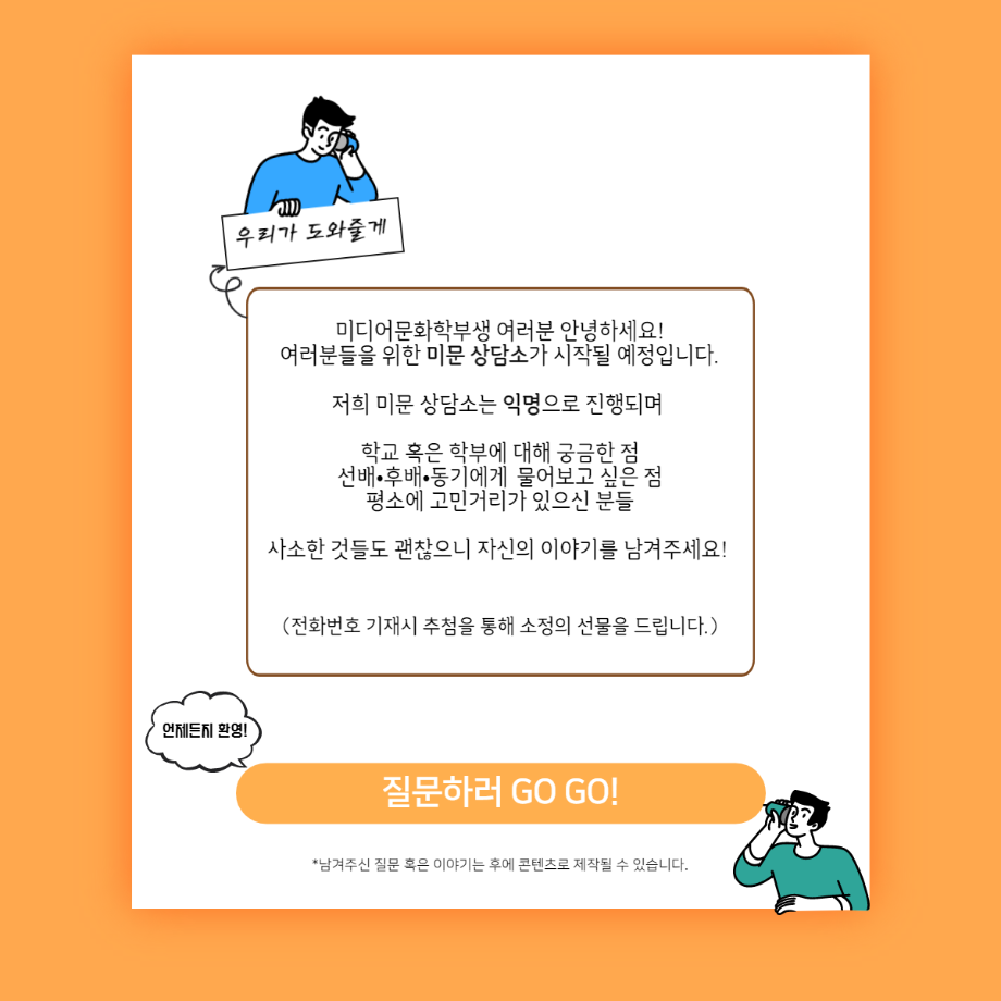 본문 시작 홈으로 커뮤니티 학부소개 교육과정 학부소식 커뮤니티 홈페이지가이드 학생회 학생회 동아리 자료실 장비대여 자유게시판 학생회 페이스북 트위터 프린트 [학생회 활동] 미문상담소 학생회 3237 2022-04-30 미디어문화학부생 여러분 안녕하세요! 미문 상담소에 대해 안내드립니다😊 학부에 대해 궁금한 점, 선배•후배•동기에게 물어보고 싶은 점, 자신의 고민 등 사소한 것들도 괜찮으니 자신의 이야기를 남겨주세요! 익명으로 진행되므로 편하게 작성해주세요 :) *남겨주신 질문 혹은 이야기는 후에 콘텐츠로 제작될 수 있습니다! (전화번호를 남겨주실 경우, 추첨을 통해 소정의 선물을 드릴 예정입니다.) https://naver.me/5okYea3H 목록 이전[학생회 활동] 2021-2 응원 간식 포장 다음 [학생회 활동] 2022년 1학기 선.사.친 활동 중간보고 담당부서 : 미디어문화학부 담당자 : - 연락처 : 043-649-1760 최종수정일 : 2024-10-26 만족도조사 만족도 조사 이 페이지에서 제공하는 정보에 대하여 만족하시나요? 매우만족 만족 보통 불만족 매우불만족