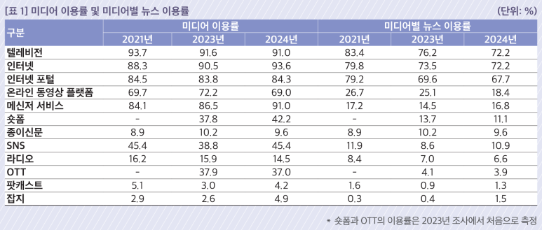 2024년 한국언론진흥재단의 <언론수용자 조사>1) 결과, 수용자의 미디어 이용률은 대체로 상승한 가운데, 이들 미디어를 통한 뉴스 이용률은 대체로 하락했습니다.