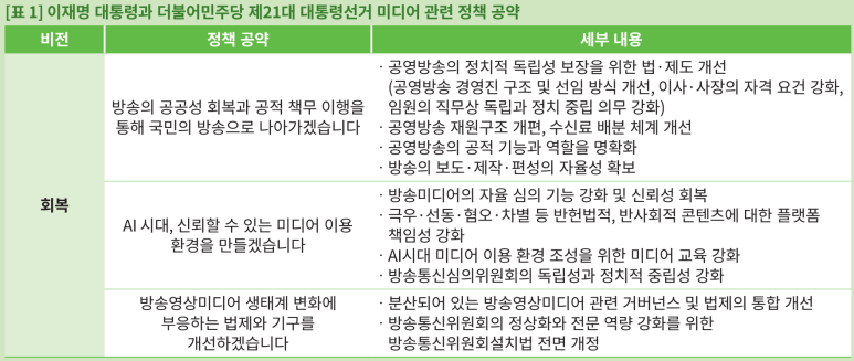 미디어 관련 정책은 이재명 대통령과 더불어민주당의 대선 10대 공약 중 정책 1순위에 포함됐습니다. 공영방송 지배 구조·재원 구조·자율성 확보, 분산된 미디어 거버넌스 개편, 인터넷 포털의 책임성과 이용자 보호 강화 등입니다.