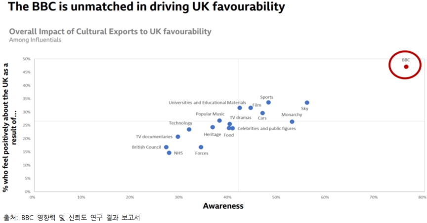 전 세계 오피니언 리더층에서 영국 관련 가장 호감도가 높은 문화 수출품으로 ‘BBC’를 꼽았습니다. 또한 응답자 중 76%가 BBC 뉴스를 인지하고 있었는데, 이는 영국 스포츠, 영화, 대학 등과 비교해 높은 수치입니다.