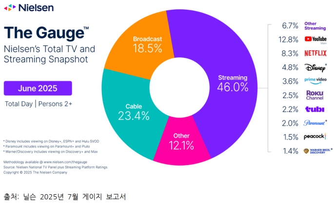 "미국 지상파 방송이 100년 역사상 가장 심각한 위기를 맞고 있다. 닐슨이 7월 15일 발표한 최신 <더 게이지>(Gauge)1) 보고서에 따르면, 2025년 6월 지상파 방송(Broadcast)의 TV 시청 점유율은 18.5%로, 사상 최초로 20% 선이 붕괴했다. 반면 넷플릭스를 비롯한 스트리밍 서비스는 전체 TV 시청의 46.0%를 차지하며 전통 방송을 완전히 압도하고 있다. 이는 단순한 시청률 경쟁을 넘어선 생존 투쟁이다. "