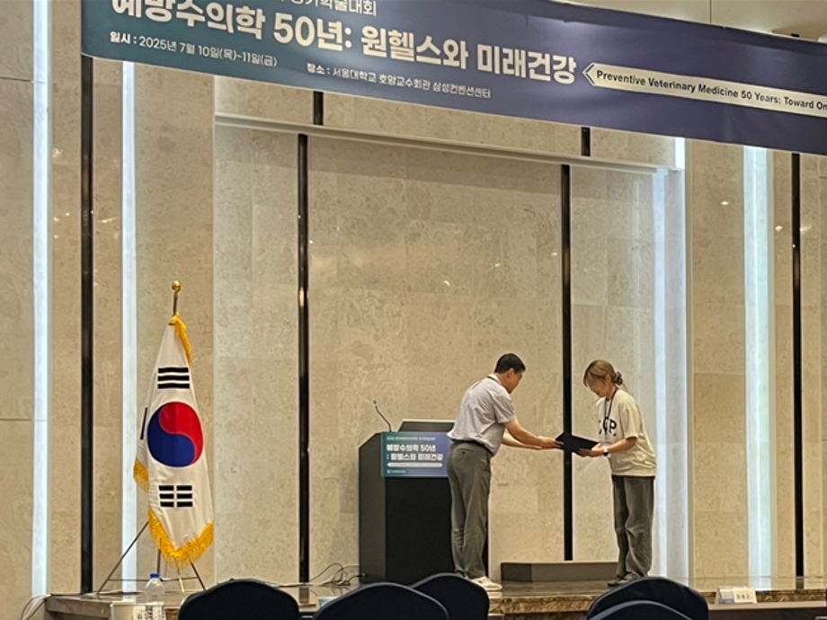 세명대학교 동물보건학과 조유진, 오은서 학생이 최근 열린 2025 한국예방수의학회에서 우수포스터상을 수상하였습니다. 한국예방수의학회는 동물과 인간의 건강을 통합적으로 바라보는 ‘One Health’ 관점에서, 인수공통감염병·항생제 내성 등 공중보건과 수의학의 융합 분야를 선도하는 권위 있는 학술단체입니다.