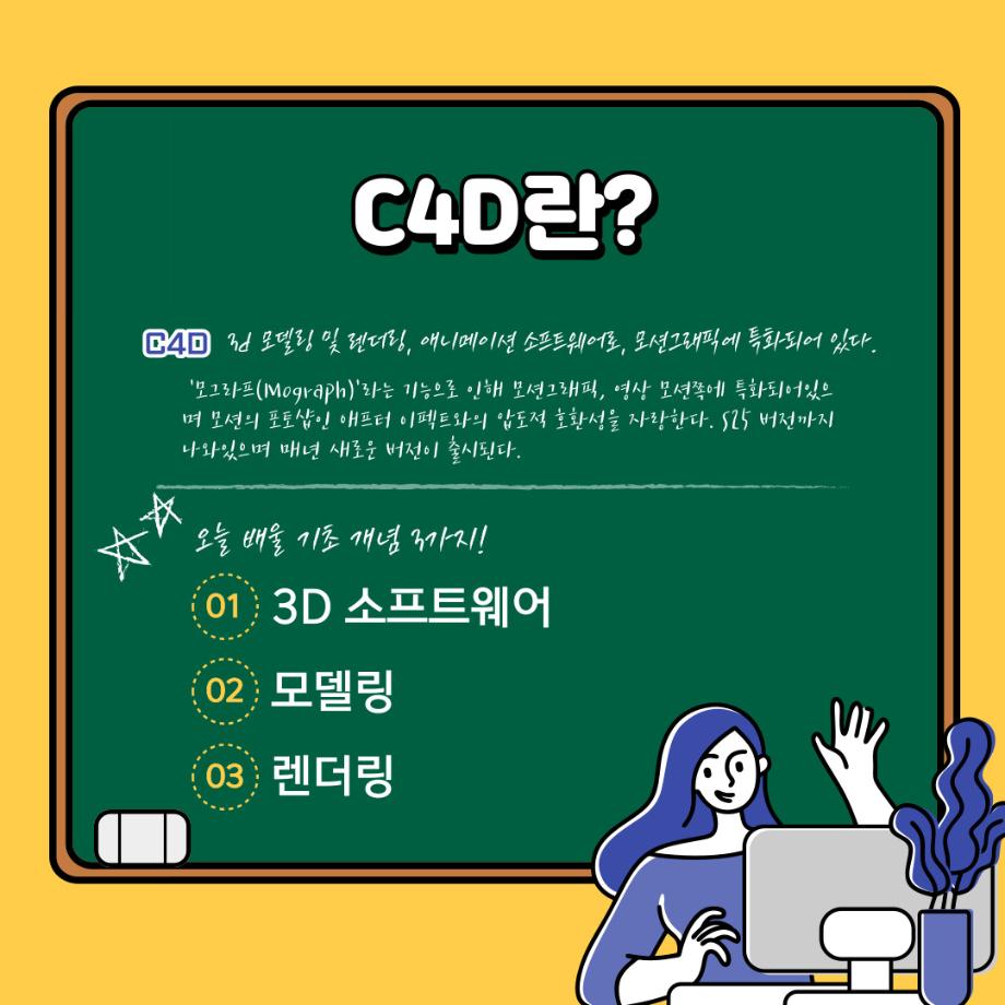 본문 시작 홈으로 학과자랑 학과소개 학과과정 시영소식 입학/취업 AI 학과자랑 SNS소통 홈페이지가이드 갤러리 학과자랑 갤러리 공모전 동아리 졸업전시회 갤러리 페이스북 트위터 프린트 예비 대학생을 위한 디자인 프로그램 설명 7탄 (Cinema 4D) 시각영상디자인학과 2263 2022-02-13 2학년 2학기에 배우는 시네마4d 입니다. 목록 이전예비 대학생을 위한 디자인 프로그램 설명 6탄 (XD) 다음 예비 대학생을 위한 디자인 프로그램 설명 8탄 (3D Max) 담당부서 : 시각영상디자인학과 담당자 : - 연락처 : 043-649-1726 최종수정일 : 2024-10-26 만족도조사 만족도 조사 이 페이지에서 제공하는 정보에 대하여 만족하시나요? 매우만족 만족 보통 불만족 매우불만족