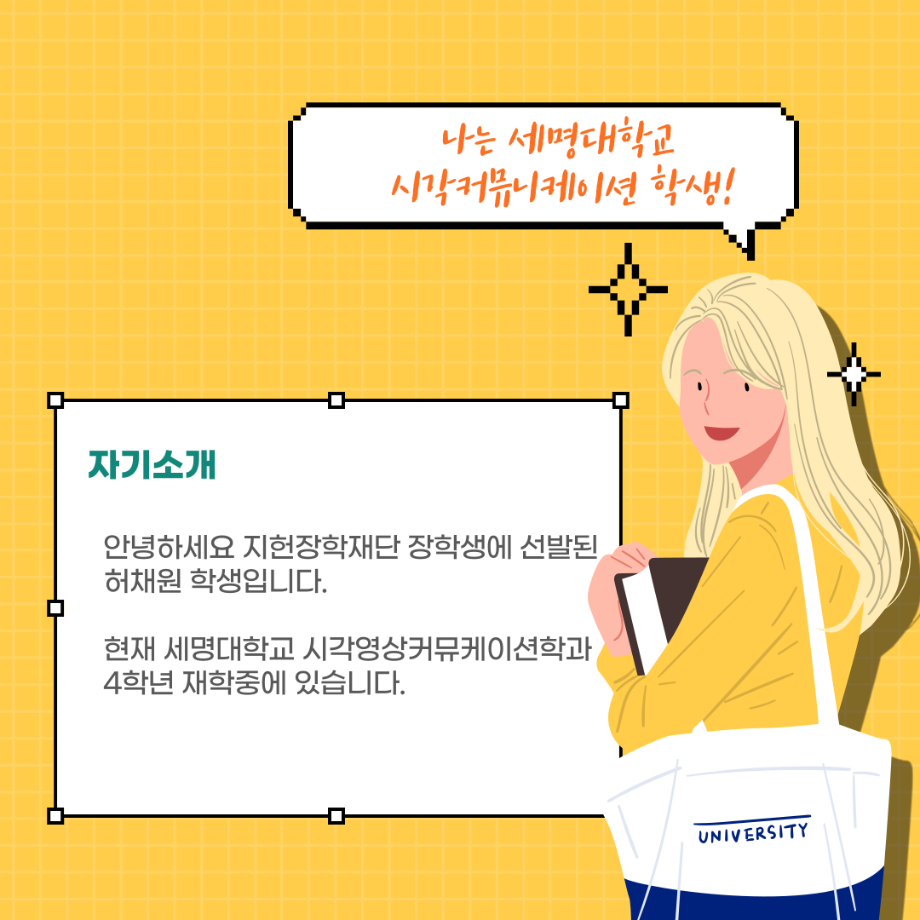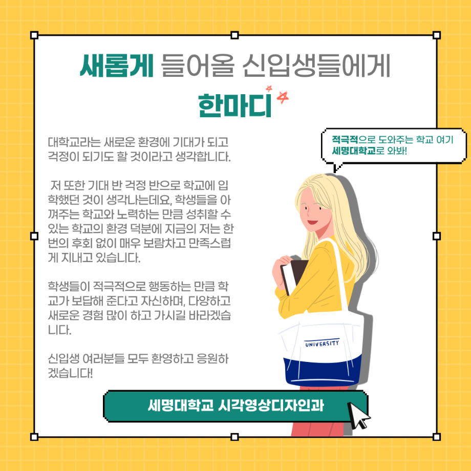 본문 시작 홈으로 학과자랑 학과소개 학과과정 시영소식 입학/취업 AI 학과자랑 SNS소통 홈페이지가이드 갤러리 학과자랑 갤러리 공모전 동아리 졸업전시회 갤러리 페이스북 트위터 프린트 지헌장학재단 장학생 소개 (1) 시각영상디자인학과 4330 2022-04-28 목록 이전귀여운 세명대 마스코트 이모티콘! 다음 지헌장학재단 장학생 소개(2) 담당부서 : 시각영상디자인학과 담당자 : - 연락처 : 043-649-1726 최종수정일 : 2024-10-26 만족도조사 만족도 조사 이 페이지에서 제공하는 정보에 대하여 만족하시나요? 매우만족 만족 보통 불만족 매우불만족