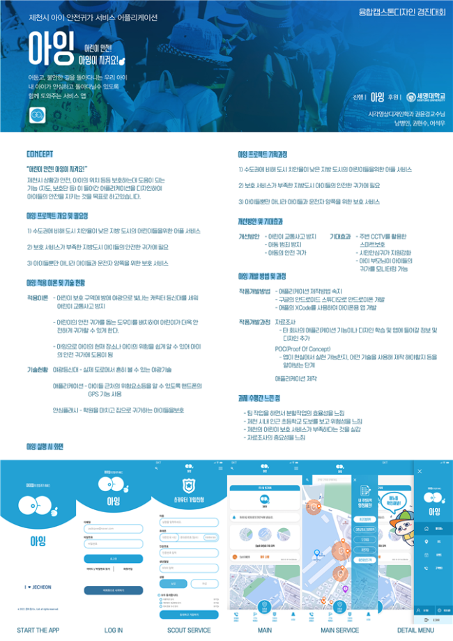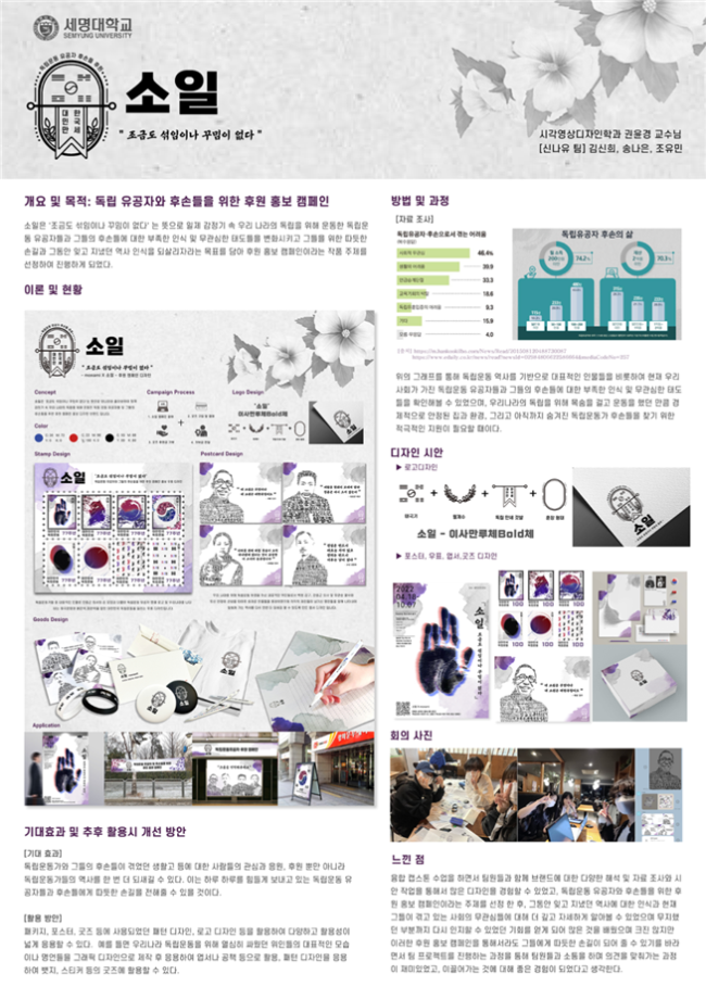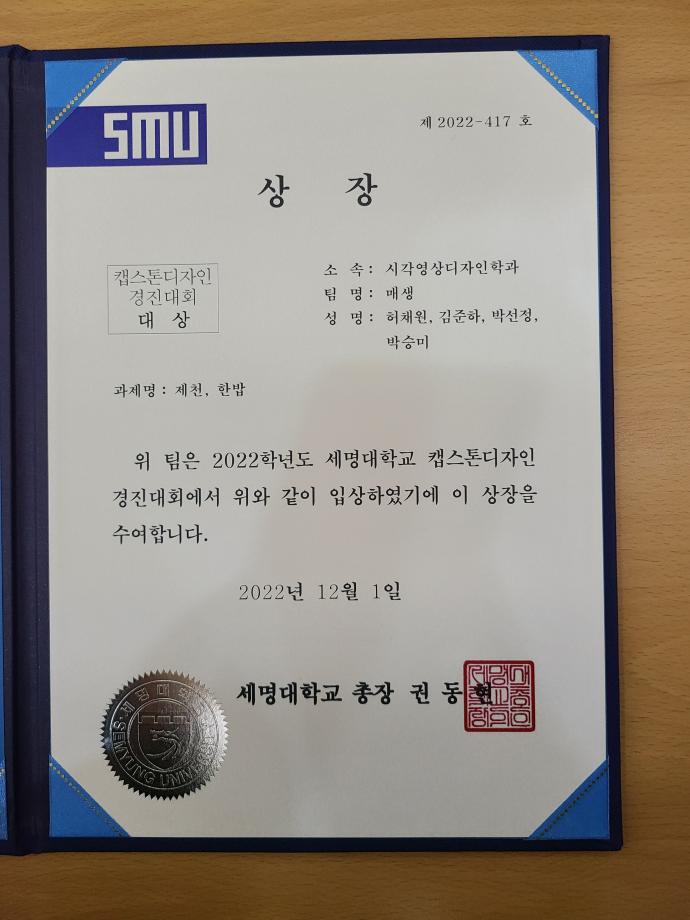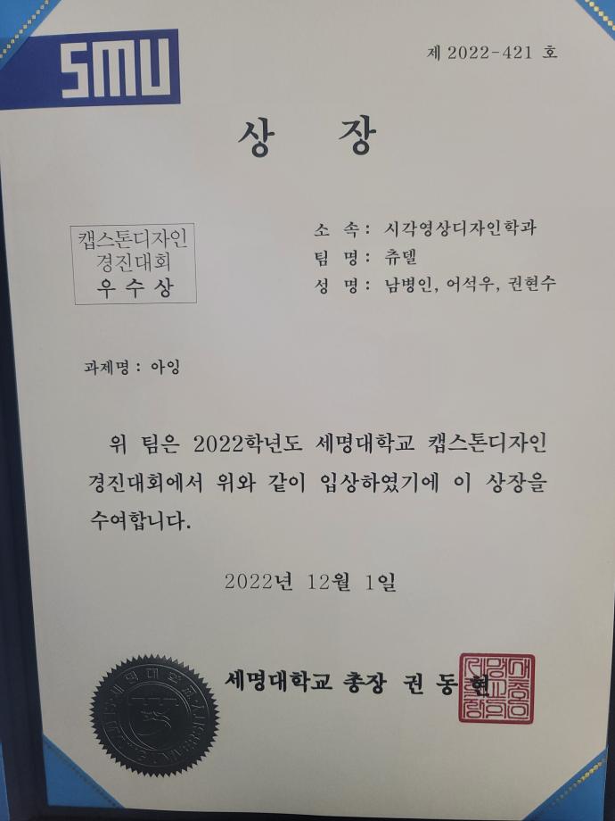 본문 시작 홈으로 학과자랑 학과소개 학과과정 시영소식 입학/취업 AI 학과자랑 SNS소통 홈페이지가이드 갤러리 학과자랑 갤러리 공모전 동아리 졸업전시회 갤러리 페이스북 트위터 프린트 2022학년도 캡스톤디자인 경진대회 - 대상/우수상 수상 시각영상디자인학과 10907 2022-12-10 2022학년도 캡스톤디자인 경진대회 - 대상/우수상 수상 본교 2021-2학기, 2022-1학기 캡스톤디자인 운영 학부(과) 대상으로 심사하여, 12월 1일 우리 학과 4학년 3팀이 본선에 올라가 그중에서, 매생팀(대상-제천,한밥)과 츄델팀(우수상-아잉)이 좋은 성적을 거두었습니다. 신나유팀(소일)도 본선 진출로 대회에 함께 하였습니다. 모두 모두 축하합니다. 목록 이전우리 학과를 모두 보여줄게! <시각·영상디자인학과 편> 다음 포탈시스템에 등장한 스타 세룡이 담당부서 : 시각영상디자인학과 담당자 : - 연락처 : 043-649-1726 최종수정일 : 2024-10-26 만족도조사 만족도 조사 이 페이지에서 제공하는 정보에 대하여 만족하시나요? 매우만족 만족 보통 불만족 매우불만족