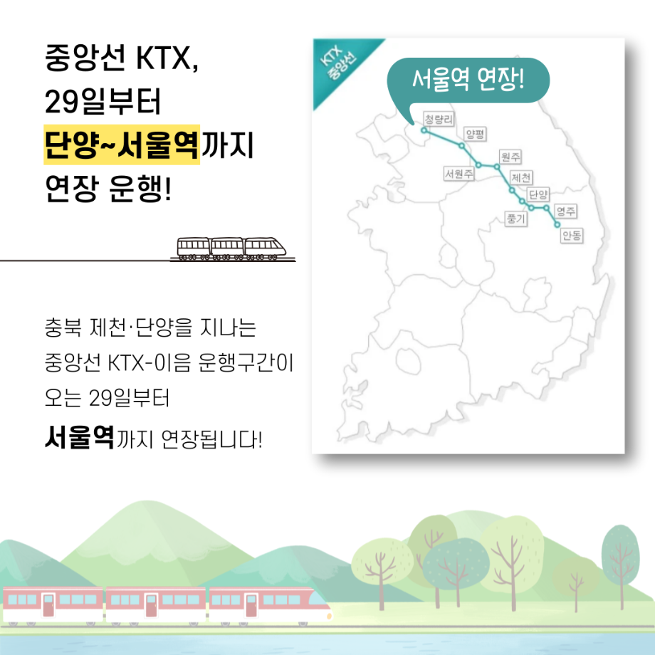 본문 시작 홈으로 학과자랑 학과소개 학과과정 시영소식 입학/취업 AI 학과자랑 SNS소통 홈페이지가이드 갤러리 학과자랑 갤러리 공모전 동아리 졸업전시회 갤러리 페이스북 트위터 프린트 KTX중앙선 연장 안내 시각영상디자인학과 2194 2023-12-28 12/29 부터 제천, 단양을 지나는 중앙선 KTX가 서울역까지 연장됩니다! 열차 또한 증차되고, 단양↔서울간 소요 시간도 단축되면서 세명대↔서울간 소요 시간도 단축됩니다 편리한 통학과 함께 더욱 가까워진, 재미있는 경험 가득한 세명대학교로 오세요! 목록 이전제32회 대전디자인어워드 특별상 다음 2023년 시각영상디자인학과 공모전 수상 실적 담당부서 : 시각영상디자인학과 담당자 : - 연락처 : 043-649-1726 최종수정일 : 2024-10-26 만족도조사 만족도 조사 이 페이지에서 제공하는 정보에 대하여 만족하시나요? 매우만족 만족 보통 불만족 매우불만족