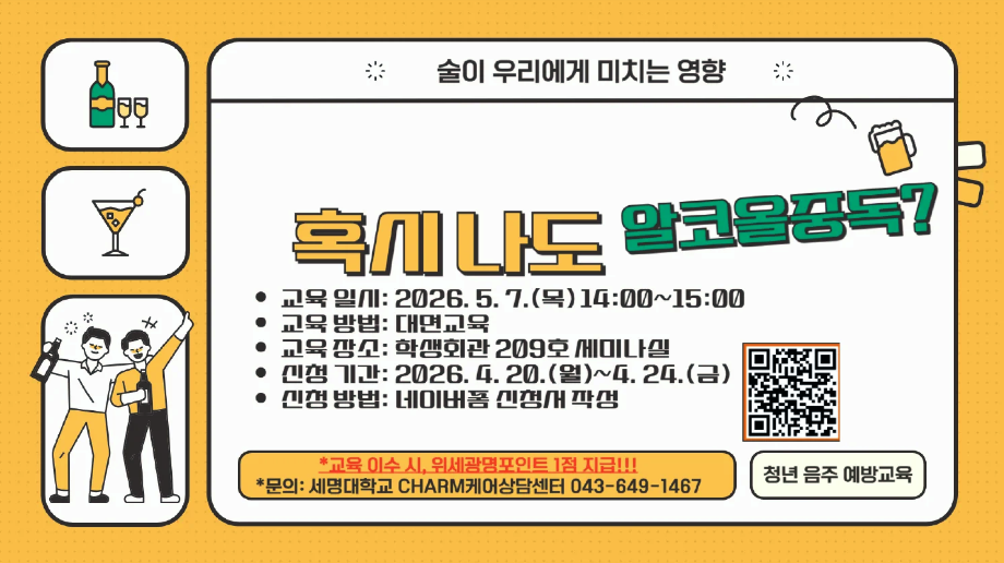 본문 시작 홈으로 학과생활 학과소개 교수소개 교과과정 학과생활 홈페이지가이드 사진게시판 공지사항 사진게시판 전공자료실 동아리 학과행사 사진게시판 페이스북 트위터 프린트 [CHARM케어상담센터 ] 2026학년도 1학기 알코올중독 예방교육 실시 아트앤산업디자인학과 18 2026-04-20 목록 이전[취창업처] [2026대일플] 졸업(예정)자 대상 고용노동부 [국민취업지원제도] 사업 안내 담당부서 : 산업디자인학과 담당자 : - 연락처 : 043-649-1436 최종수정일 : 2024-10-26 만족도조사 만족도 조사 이 페이지에서 제공하는 정보에 대하여 만족하시나요? 매우만족 만족 보통 불만족 매우불만족