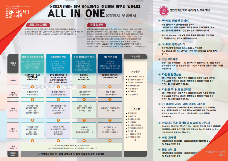 본문 시작 홈으로 학과생활 학과소개 교수소개 교과과정 학과생활 홈페이지가이드 사진게시판 공지사항 사진게시판 전공자료실 동아리 학과행사 사진게시판 페이스북 트위터 프린트 [브로셔] 2023년 산업디자인학과 소개 책자 산업디자인학과 3115 2023-09-12 목록 이전세명대 산업디자인학과를 졸업하고 무엇을 할 수 있나요?-공공/환경 디자이너 편! 다음 [졸업전시회] 2023학년도 4학년 졸업전시회 포스터 담당부서 : 산업디자인학과 담당자 : - 연락처 : 043-649-1436 최종수정일 : 2024-10-26 만족도조사 만족도 조사 이 페이지에서 제공하는 정보에 대하여 만족하시나요? 매우만족 만족 보통 불만족 매우불만족