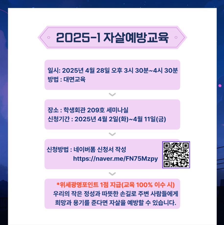 본문 시작 홈으로 학과생활 학과소개 교수소개 교과과정 학과생활 홈페이지가이드 사진게시판 공지사항 사진게시판 전공자료실 동아리 학과행사 사진게시판 페이스북 트위터 프린트 [CHARM케어상담센터] 2025학년도 1학기 자살예방교육 실시 산업디자인학과 1246 2025-04-03 목록 이전[학생처] 제10회 커뮤니티 페스티벌 다음 [산디과] 세명대학교 창업몰 OPEN_학교 기념물 제작 및 판매 담당부서 : 산업디자인학과 담당자 : - 연락처 : 043-649-1436 최종수정일 : 2024-10-26 만족도조사 만족도 조사 이 페이지에서 제공하는 정보에 대하여 만족하시나요? 매우만족 만족 보통 불만족 매우불만족