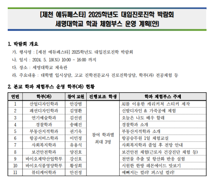 본문 시작 홈으로 커뮤니티 학과소개 교수소개 학과과정 커뮤니티 대학원 홈페이지가이드 포토갤러리 공지사항 채용정보 포토갤러리 Youtube 바로가기 Instargram 바로가기 Blog 바로가기 Facebook 바로가기 포토갤러리 페이스북 트위터 프린트 [제천 에듀페스타] 2025학년도 대입진로진학 박람회: 세명대학교 학과 체험부스 운영 뷰티케어학과 2071 2024-05-20 5월 18일 토요일, 세명대학교 체육관에서 2025학년도 대학 입시를 준비하고 있는 입시생들을 대상으로 한 진학 박람회가 열렸습니다. 우리 학과도 학과 체험부스를 운영하며 퍼스널 컬러 진단 프로그램을 진행했습니다:) 목록 이전㈜CCLIME(끌리메) 기업 설명회 다음 창업대체학점제 신청자를 모집