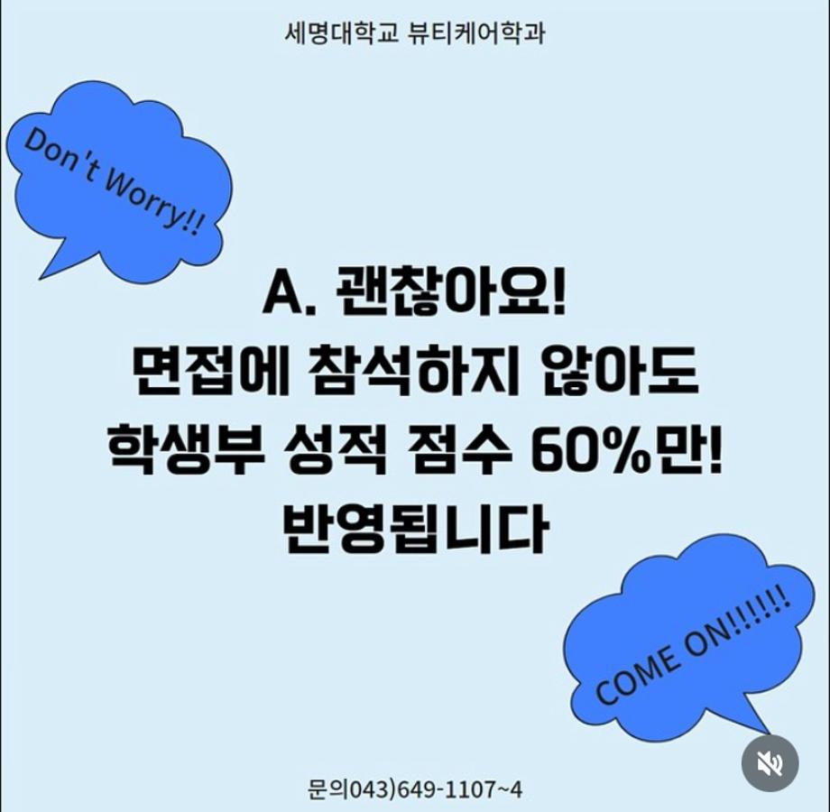 본문 시작 홈으로 커뮤니티 학과소개 교수소개 학과과정 커뮤니티 대학원 홈페이지가이드 포토갤러리 공지사항 채용정보 포토갤러리 Youtube 바로가기 Instargram 바로가기 Blog 바로가기 Facebook 바로가기 포토갤러리 페이스북 트위터 프린트 면접 우수자 전형 바이오코스메틱학과 1710 2024-10-02 📍면접우수자전형 면접에 응시하지 않아도! 괜찮습니다! 걱정하시마세요~ 다만 면접에 참석하지 않을시, 학생부 성적 점수 60%만 반영되니까 꼭 알아두고! 충분히 생각하고 결정합시다!! . 목록 이전043-649-1637 / 2025학년도 예비 신입생 여러분들께 수시 입시 무료 응시쿠폰(진학사,유웨이어플라이무료)을 드립니다. 다음 📣 2025 세명대학교 “뷰티케어학과” 면접우수자전형 면접 일정 📣