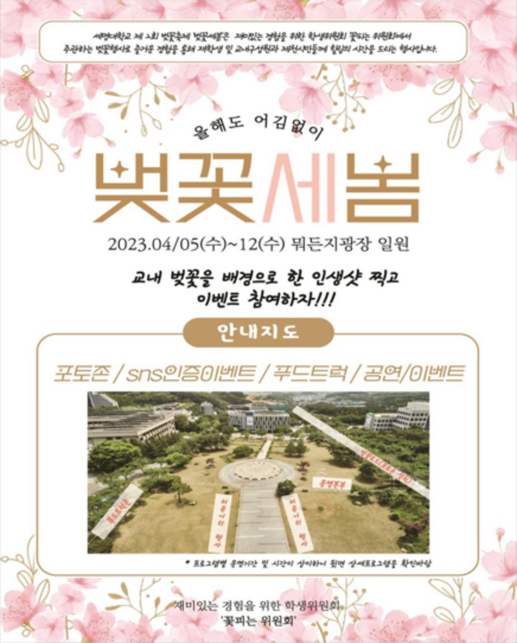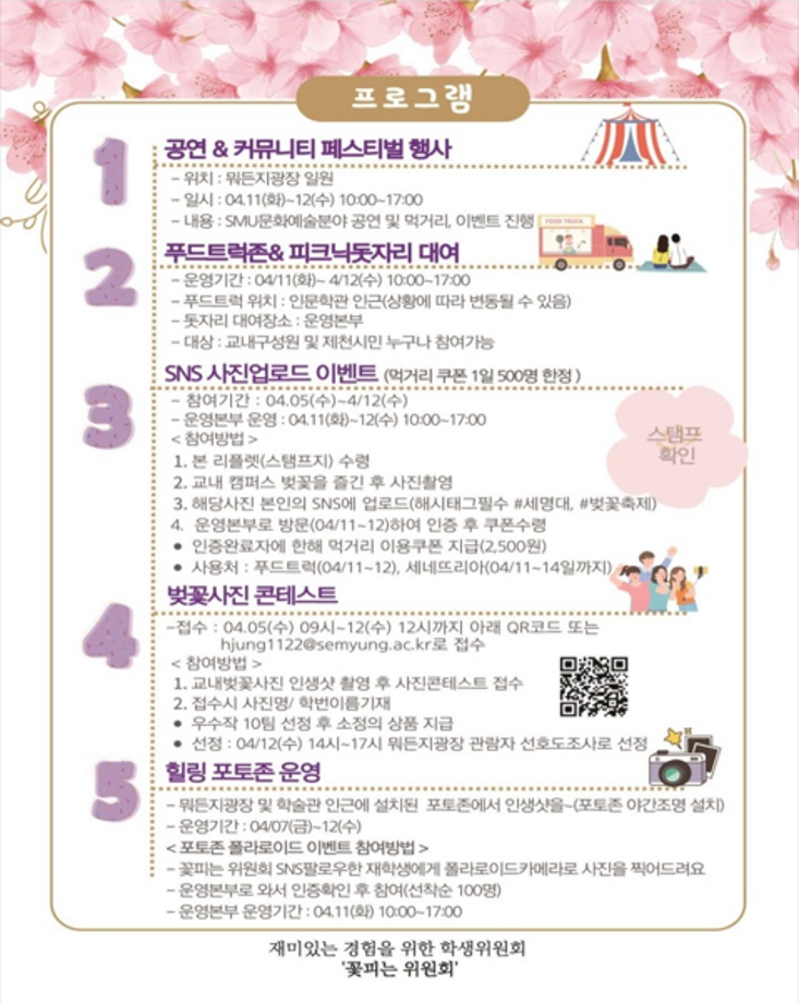 본문 시작 홈으로 커뮤니티 학과소개 교수소개 학과과정 커뮤니티 대학원 홈페이지가이드 포토갤러리 공지사항 채용정보 포토갤러리 Youtube 바로가기 Instargram 바로가기 Blog 바로가기 Facebook 바로가기 포토갤러리 페이스북 트위터 프린트 🌸 벚꽃세봄 🌸 뷰티케어학 2471 2023-04-04 일정 : 2023.04.05 (수) ~ 2023.04.12 (수) 장소 : 뭐든지 광장 일원 🌸 세명대학교가 제2회 벚꽃축제 “벚꽃세봄”은 재미있는 경험을 위한 학생위원회 ‘꽃피는 위원회’에서 주관하는 벚꽃 행사입니다! 재학생 및 교내 구성원과 제천시민 분들께 힐링을 드립니다 :) 🌸 벚꽃 사진 콘테스트, 포토존, 돗자리 대여, 즐거운 공연까지! 다양한 행사와 즐거움이 가득한 행사를 즐겨보세요😆 목록 다음 세명대학교 등록금 환불제 다음 🎊세명대학교 제 30회 청룡축전🎊