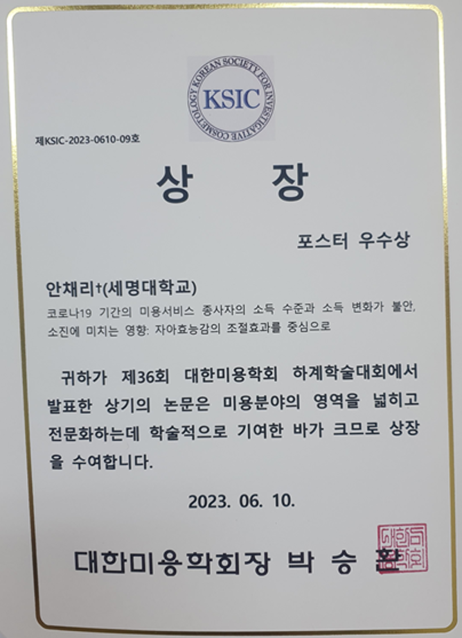 본문 시작 홈으로 커뮤니티 학과소개 교수소개 학과과정 커뮤니티 대학원 홈페이지가이드 포토갤러리 공지사항 채용정보 포토갤러리 Youtube 바로가기 Instargram 바로가기 Blog 바로가기 Facebook 바로가기 포토갤러리 페이스북 트위터 프린트 세명대 뷰티케어학과 안채리 교수, 제36회 대한미용학회 하계학술대회 포스터 우수상 수상 뷰티케어학 2966 2023-07-04 지난 6월 10일, 한국열린사이버대학교에서 대한미용학회(회장 박승환)가 주관하는 하계학술대회 및 전시회가 있었습니다. 이에 우리 학과 안채리 교수님이 '코로나19 기간의 미용서비스 종사자의 소득 수준과 소득 변화가 불안, 소진에 미치는 영향: 자아효능감의 조절효과를 중심으로'라는 제목으로 포스터를 발표하시어, 포스터 우수상을 수상하셨습니다😃👍 목록 이전♦피부 실습실 소개♦ 다음 세명고등학교 입시박람회