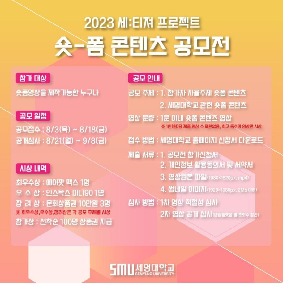 본문 시작 홈으로 커뮤니티 학과소개 교수소개 학과과정 커뮤니티 대학원 홈페이지가이드 포토갤러리 공지사항 채용정보 포토갤러리 Youtube 바로가기 Instargram 바로가기 Blog 바로가기 Facebook 바로가기 포토갤러리 페이스북 트위터 프린트 2023 세:티져 프로젝트 숏폼 콘텐츠 공모전 뷰티케어학 2632 2023-08-03 2023 세:티져 프로젝트 숏폼 콘텐츠 공모전 숏폼영상을 만들 수 있는 누구나 참여가능!! 세명대학교와 관련한 주제 또는 일상에서의 자율주제로 영상을 제작하여 공모전에 참여하고, 에어팟맥스, 인스탁스, 문화상품권 등 다양한 상품을 받아가 보세요~ 목록 다음 🌻2023년도 2학기 수강신청 안내 🌻 다음 청주 더한 뷰티 미용학원 입시설명회