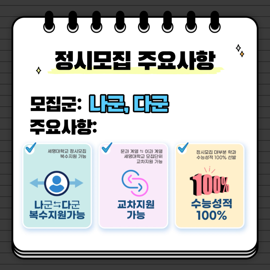 본문 시작 홈으로 커뮤니티 학과소개 교수소개 학과과정 커뮤니티 대학원 홈페이지가이드 포토갤러리 공지사항 채용정보 포토갤러리 Youtube 바로가기 Instargram 바로가기 Blog 바로가기 Facebook 바로가기 포토갤러리 페이스북 트위터 프린트 세명대학교 2024학년도 정시모집 안내 뷰티케어학 2749 2023-11-28 2024학년도 정시모집 안내입니다. 원서접수 기간을 비롯한 주요 사항이 나와 있으니 꼭! 확인하시기 바랍니다:) 목록 이전2024학년도 세명대학교 수시모집 최초합격자 등록 안내 다음 더 가까워진 세명대학교!