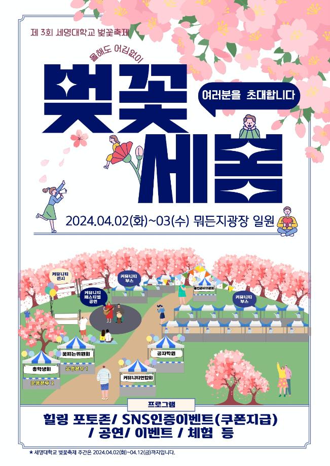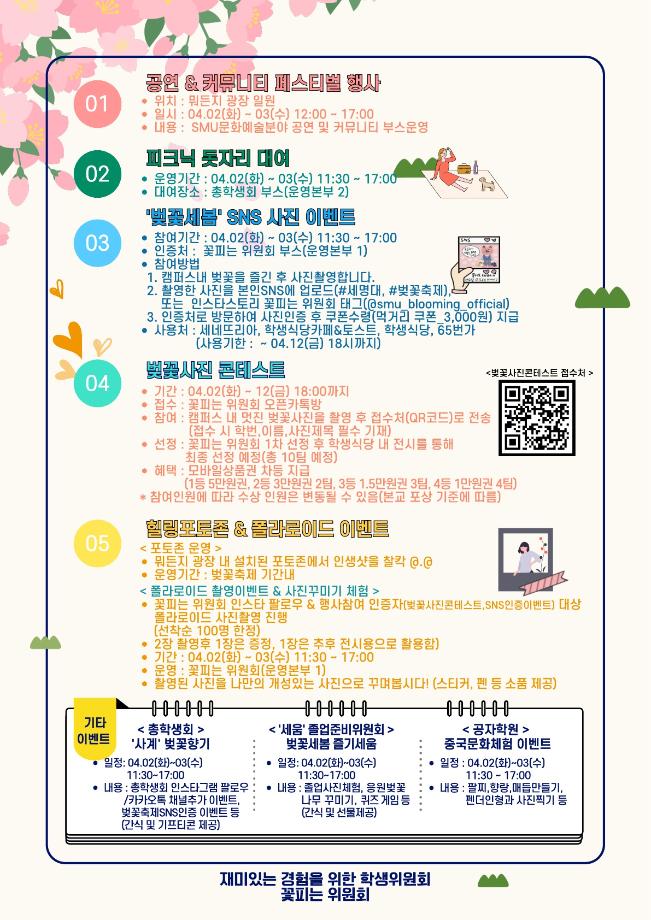 본문 시작 홈으로 커뮤니티 학과소개 교수소개 학과과정 커뮤니티 대학원 홈페이지가이드 포토갤러리 공지사항 채용정보 포토갤러리 Youtube 바로가기 Instargram 바로가기 Blog 바로가기 Facebook 바로가기 포토갤러리 페이스북 트위터 프린트 벚꽃세봄✨ 뷰티케어학 2004 2024-04-01 4월 2~3일, 봄을 맞아 새로운 행사가 열립니다! 여러 부스 활동들과 먹거리, 공연등이 펼쳐지니 많은 관심과 참여 부탁드립니다🩷 전시,부스 종류와 공연시간등을 잘 참고하셔서 즐기시길 바래요✨ 전시-10:00~17:00 부스-11:30~17:00 공연-14:00~16:00 📍뭐든지 광장 (위치는 지도 참고) 목록 이전커뮤니티 페스티벌✨ 다음 세명진로 festival 도전 특강: ‘레드오션에서 브랜드로 성공하는 마케팅’