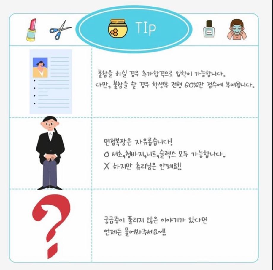 본문 시작 홈으로 커뮤니티 학과소개 교수소개 학과과정 커뮤니티 대학원 홈페이지가이드 포토갤러리 공지사항 채용정보 포토갤러리 Youtube 바로가기 Instargram 바로가기 Blog 바로가기 Facebook 바로가기 포토갤러리 페이스북 트위터 프린트 📣 세명대학교 “뷰티케어학과” 면접일은 2024.10.11(금)입니다! 바이오코스메틱학과 1995 2024-10-08 📣 세명대학교 “뷰티케어학과” 면접일은 2024.10.11(금)입니다! 1부-pm.1시/2부-pm.3시30분 총 두 타임으로 나눠서 진행될예정입니다! 면접 예상질문은 2024.10.7(월) 이전에 공지될 예정이니 자세한 내용은 세명대학교 홈페이지를 확인해주세요!! 목록 이전헤어기초커트1 다음 제5회 청주시장배 미용기술경연대회 금상,은상!