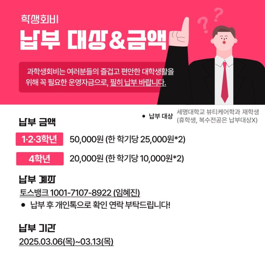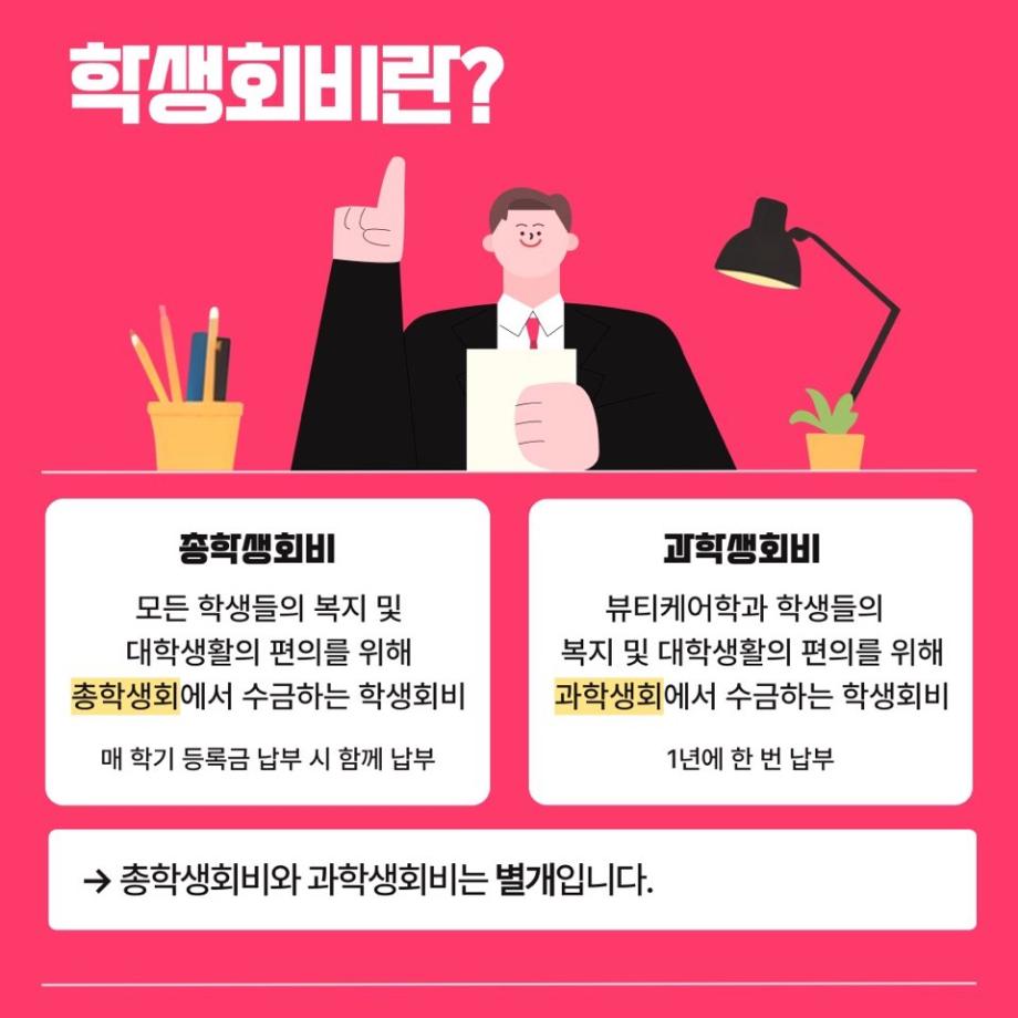 📍과학생회비는 뷰티케어학과 학생들의 복지 및 대학생활의 편의를 위해 과학생회에서 수금하는 학생회비로 1년에 한 번씩 납부합니다.