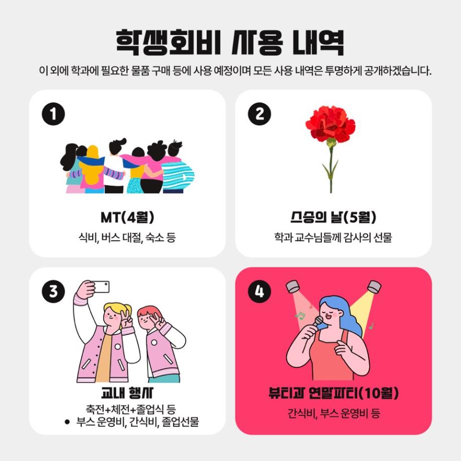 📍 학생회비는 학생회의 개인적 용무에 사용 되는 것이 아닌 학과 운영 목적의 회비로 모이는 금액에 따라 대학생활을 하며 즐길 수 있는 다양한 경험 기회가 결정될 수 있습니다. 편하고 더욱 즐거운 학과생활을 위해 학생회를 믿으시고 필히 납부 바랍니다.