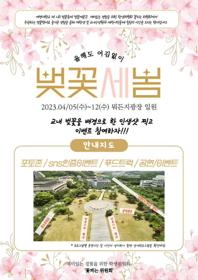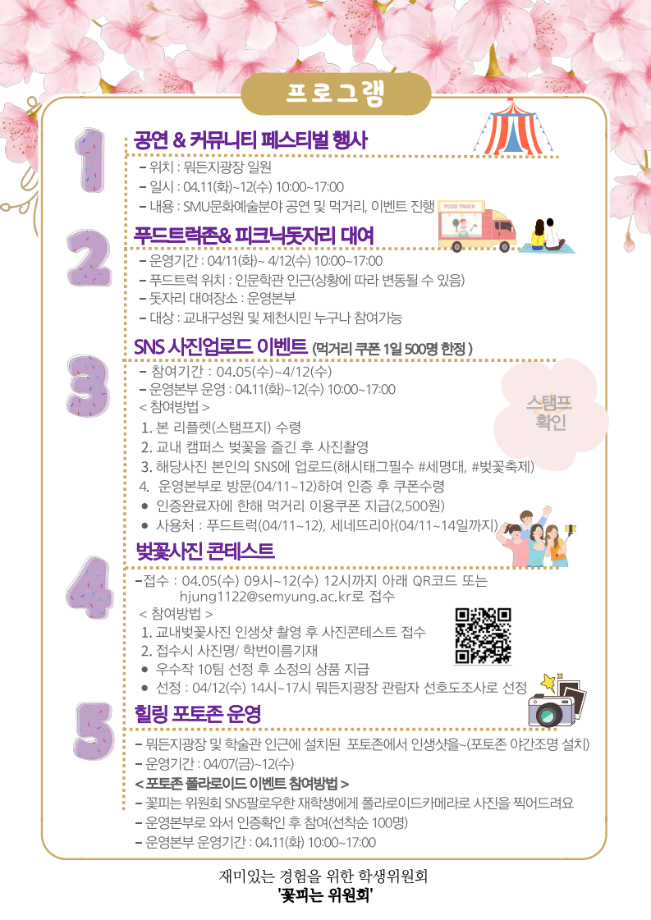 본문 시작 홈으로 커뮤니티 학과소개 입학정보 교수소개 학과과정 커뮤니티 공연예매 안내 홈페이지가이드 포토갤러리 공지사항 포토갤러리 작품DB 동아리 학사일정 학생회 포토갤러리 페이스북 트위터 프린트 제2회 세명대학교 벚꽃축제 개최 안내 연기예술학과 2690 2023-04-04 캠퍼스에 설레는 봄이 찾아왔습니다. 세명대학교 학생위원회인 '꽃피는 위원회'에서 준비한 제2회 세명대학교 벚꽃축제 개최 안내 목록 이전2023학년도 학생대상 폭력예방교육 다음 제8회 커뮤니티 페스티벌 담당부서 : 연기예술학과 담당자 : - 연락처 : 043-649-1733 최종수정일 : 2024-10-26 만족도조사 만족도 조사 이 페이지에서 제공하는 정보에 대하여 만족하시나요? 매우만족 만족 보통 불만족 매우불만족